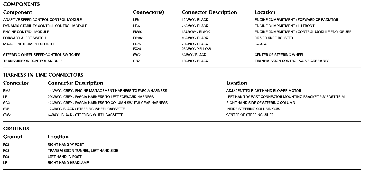 Locations: The location views for Ground Points, In-Line Harness Connectors, Harnesses, and Control Modules depicted within these diagrams can be found at Vehicle/Locations. Locations
