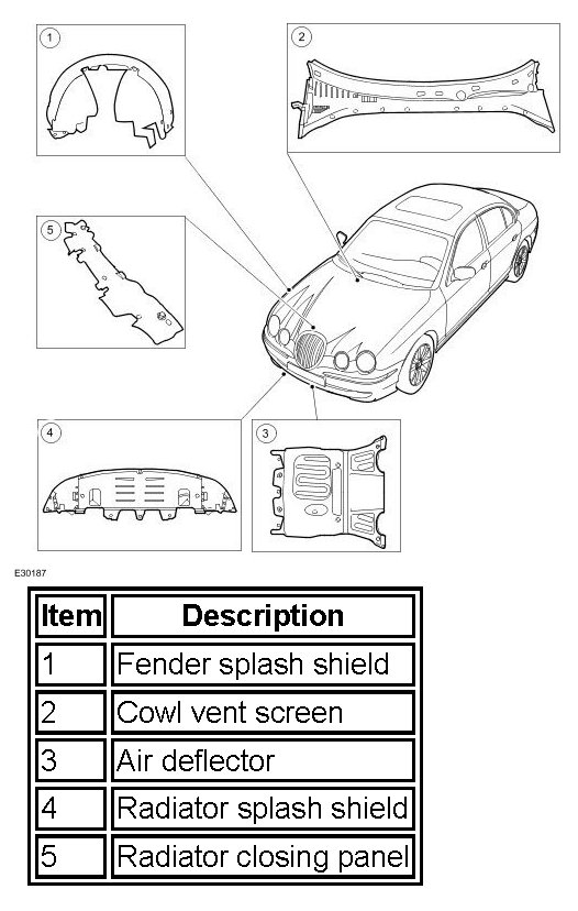 An air deflector is retained to the front subframe. The air deflector assists the flow of air under the vehicle, it also gives protection to the engine bay from dirt and water ingress. On top of the air deflector an acoustic pad is fitted which is covered by a heat shield, this is designed to reduce engine and road noise.