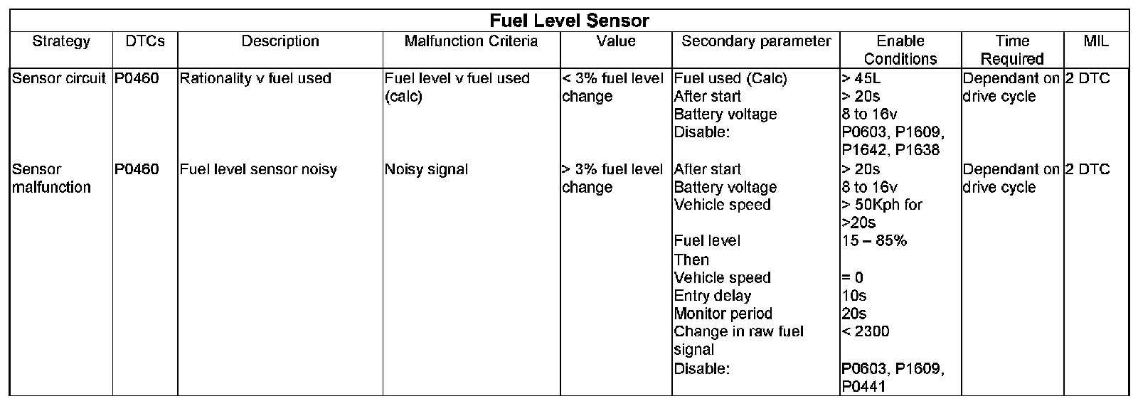Once the fuel level % has changed to satisfy the stuck monitor described above and a few other entry conditions the system will complete a fuel level noisy test in the next available idle period. When the vehicle comes to rest the fuel movement will be allowed to subside and then the output of the fuel level sensor will be monitored for a short period, during this period the output of the fuel level sensor will be integrated and compared to a threshold, which is set to find faulty fuel level sensors. This process is repeated as the fuel level falls. If the failure threshold is exceeded a 1st trip temporary failure flag will be set. A further failure in the next trip will illuminate the MIL.