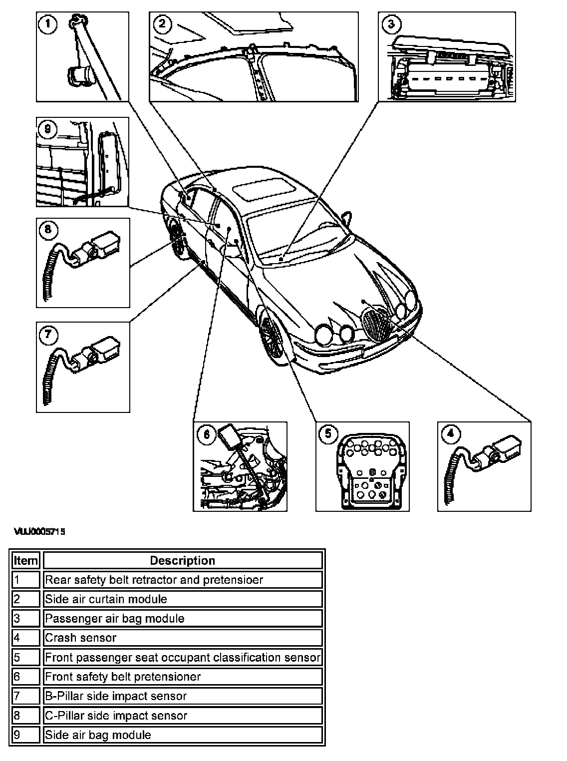 The air bag supplemental restraint system (SRS) components are shown in the following illustrations.