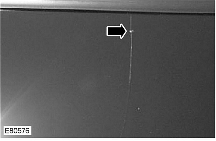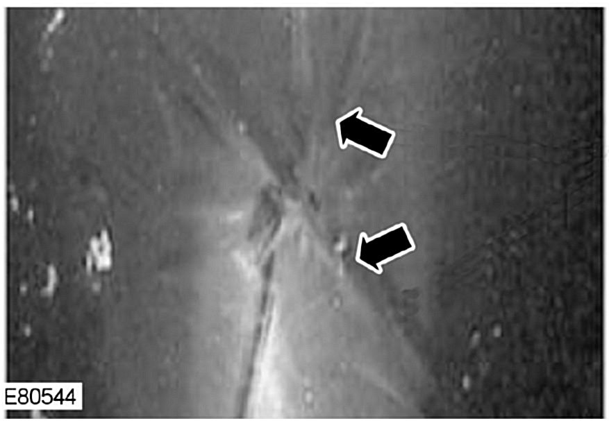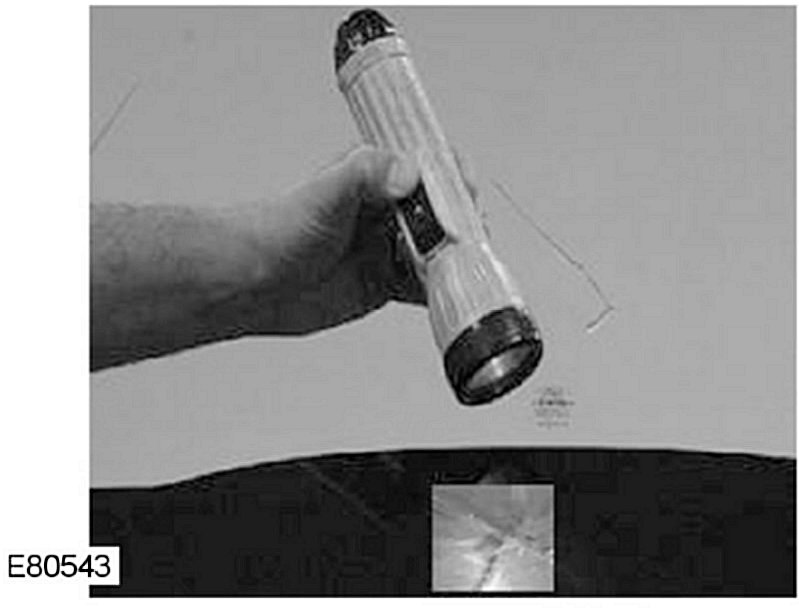 3. If visual inspection and pen test do not show surface damage point a flashlight at a 45 degree angle along the cracks in the black painted area of the windshield (see illustration E80543 in step 7).