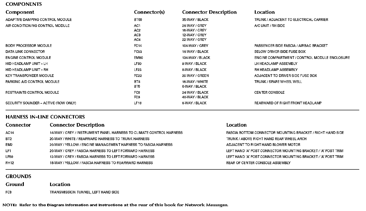 Locations: The location views for Ground Points, In-Line Harness Connectors, Harnesses, and Control Modules depicted within these diagrams can be found at Vehicle/Locations. Locations