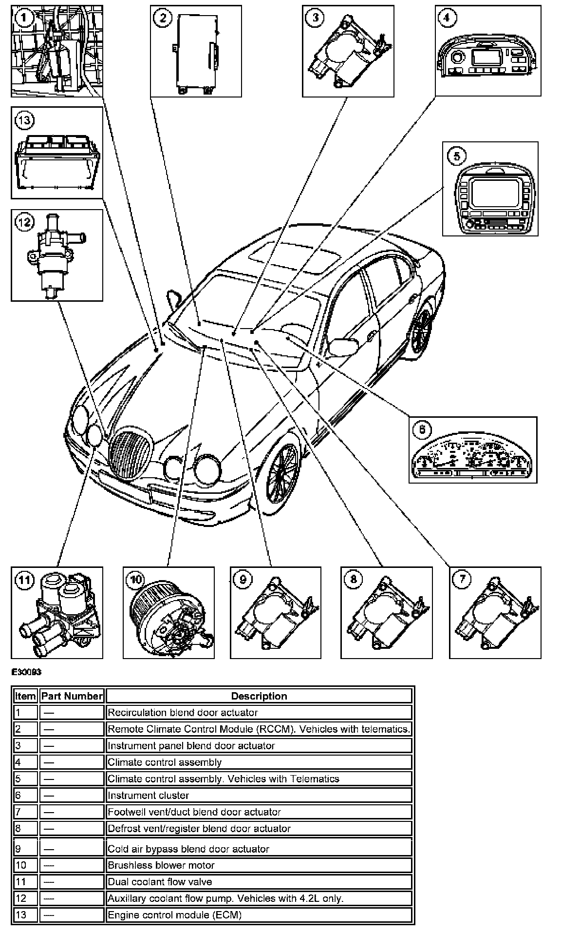 The climate control assembly automatically maintains a selected temperature for the interior of the vehicle. The system regulates the volume of airflow between the instrument panel registers, floor console registers, front and rear floor ducts, windshield defroster and side window registers. The system can automatically select between fresh and recirculated air with an optional manual override. The climate control assembly will try to provide both driver and passenger with their selected temperature for comfort. The fan controls and air distribution are not controlled individually.