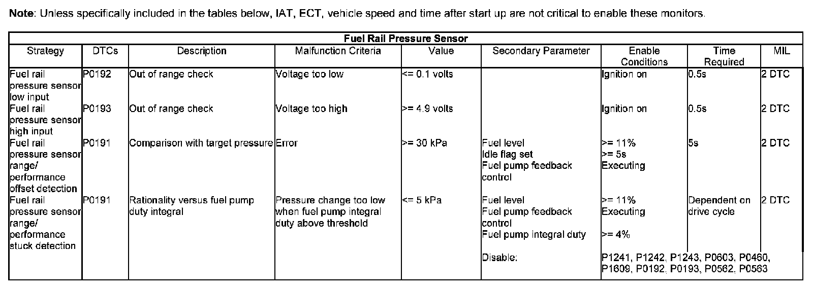 This part of the monitor executes when the vehicle is idling. When closed loop fuel pump control is executing, a settle timer is incremented. After the counter reaches 5 seconds monitoring can be started. This is to allow the system time to settle after a transition from open to closed loop fuel pump control. Once the counter is greater than 5 seconds the target pressure is checked against the actual fuel rail pressure. If the error is less than the failure threshold, a normal counter is started. If the normal counter reaches 1 second, normal judgment is made. If the target to actual error is greater than the failure threshold, a failure counter is started. If the failure counter reaches 5 seconds then failure judgment is made.