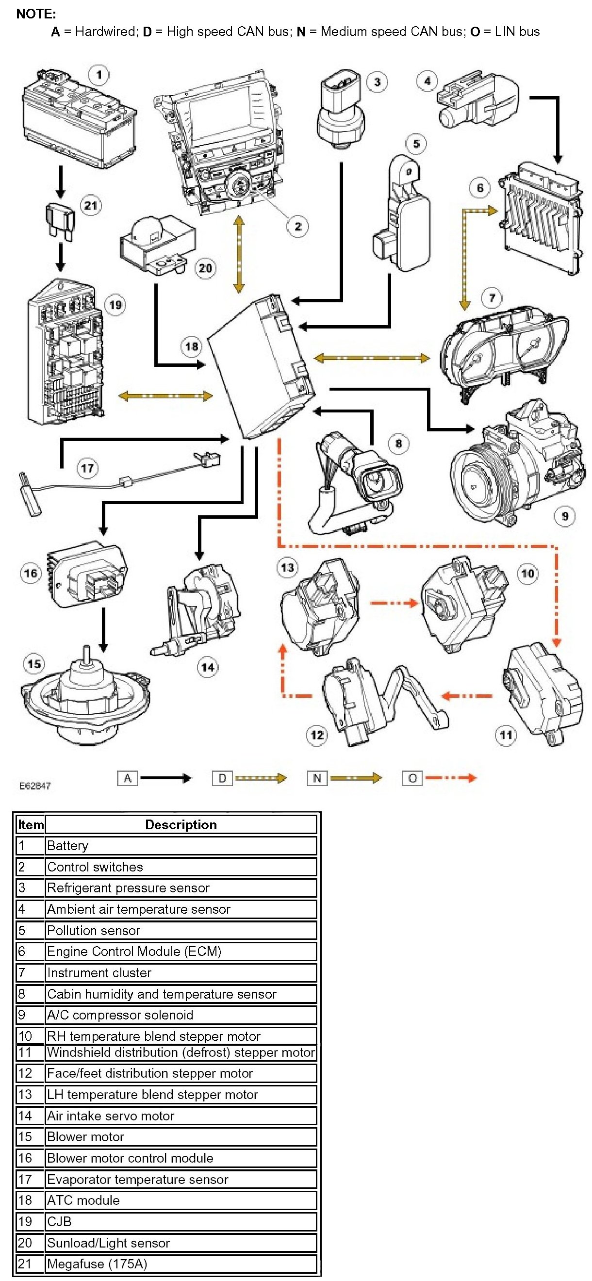 Two electrical connectors provide the interface between the ATC module, and the vehicle wiring. The ATC module uses hardwired inputs from the system sensors, the Local Interconnect Network (LIN) bus to communicate with the stepper motors and the medium speed Controller Area Network (CAN) bus to communicate with other control modules on the vehicle.