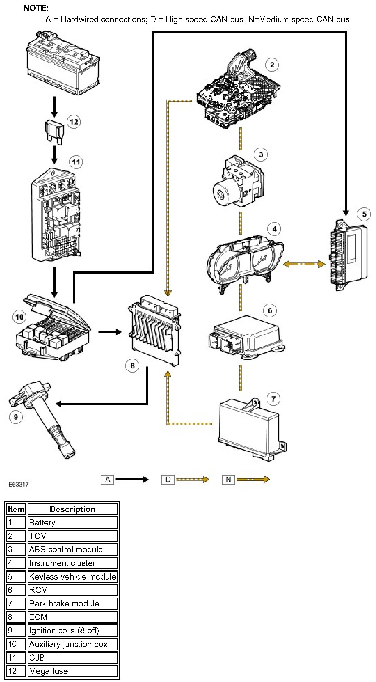 Power for the ignition coils is supplied from the main relay and a fuse in the BJB. A capacitor is connected in parallel with the power supplies to the ignition coils to suppress RFI (radio frequency interference).