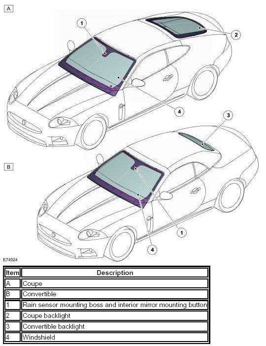 The windshield, which is constructed of 5.5 mm laminated glass with a black obscuration band, is bonded and sealed to the body aperture using Polyurethane (PU) adhesive. The mounting boss for the rain sensor is also PU bonded to the inner surface of the screen and is common to the coupe and convertible. The mounting button for the interior mirror is attached to the windshield using adhesive. A vertical fine-wire multi-strand element, located between the glass laminations, is available as an option, except for North American Specification (NAS) vehicles, to de-ice and demist the windshield and is controlled from the Touch Screen Display (TSD). The backlight is 4 mm tempered glass, green tinted and heated and bonded to the liftgate using PU adhesive. The windshield and backlight, except for the convertible model, are direct glazed to the body.