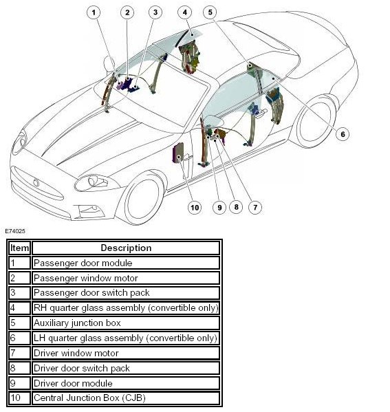 Each door glass automatically drops when the door is opened or when the convertible top is raised or lowered, and raises when either the door is shut or the top is fully raised and latched in position (glass drops fully on hood operation). The door glass can be closed via the Smart Key. Glass operation is internally controlled from switch packs located in the driver and passenger door arm rests via their respective control modules. The switch packs are illuminated when the sidelights are on.