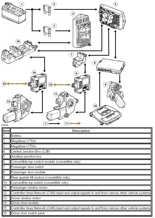 If the front glass has been either fully or partially lowered manually, the rear quarters only will be powered up. If the power supply to the driver or passenger door module is disconnected (battery disconnected, module unplugged or fuse removed) then the glass/system must re-learn the glass operating characteristics. The last known glass position is regarded as top of travel by one touch operation until re-learning has taken place. One touch down, manual up and down control and the automatic lowering of the glass for door opening are unaffected.