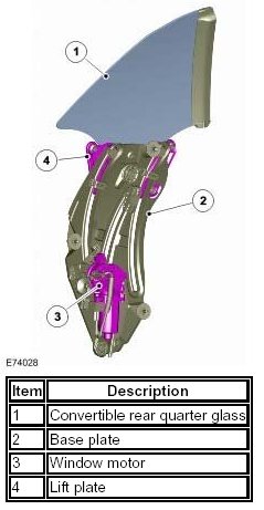 The rear quarters are operated automatically, up or down, when raising or lowering the convertible top. If the door glass is in the raised position when a request to close the top is made, the door glass and the rear quarters will be powered to the bottom of their travel. When the top is fully raised all glass will be powered up to close, rear quarters first followed by the door glass, forming a seal with the top.