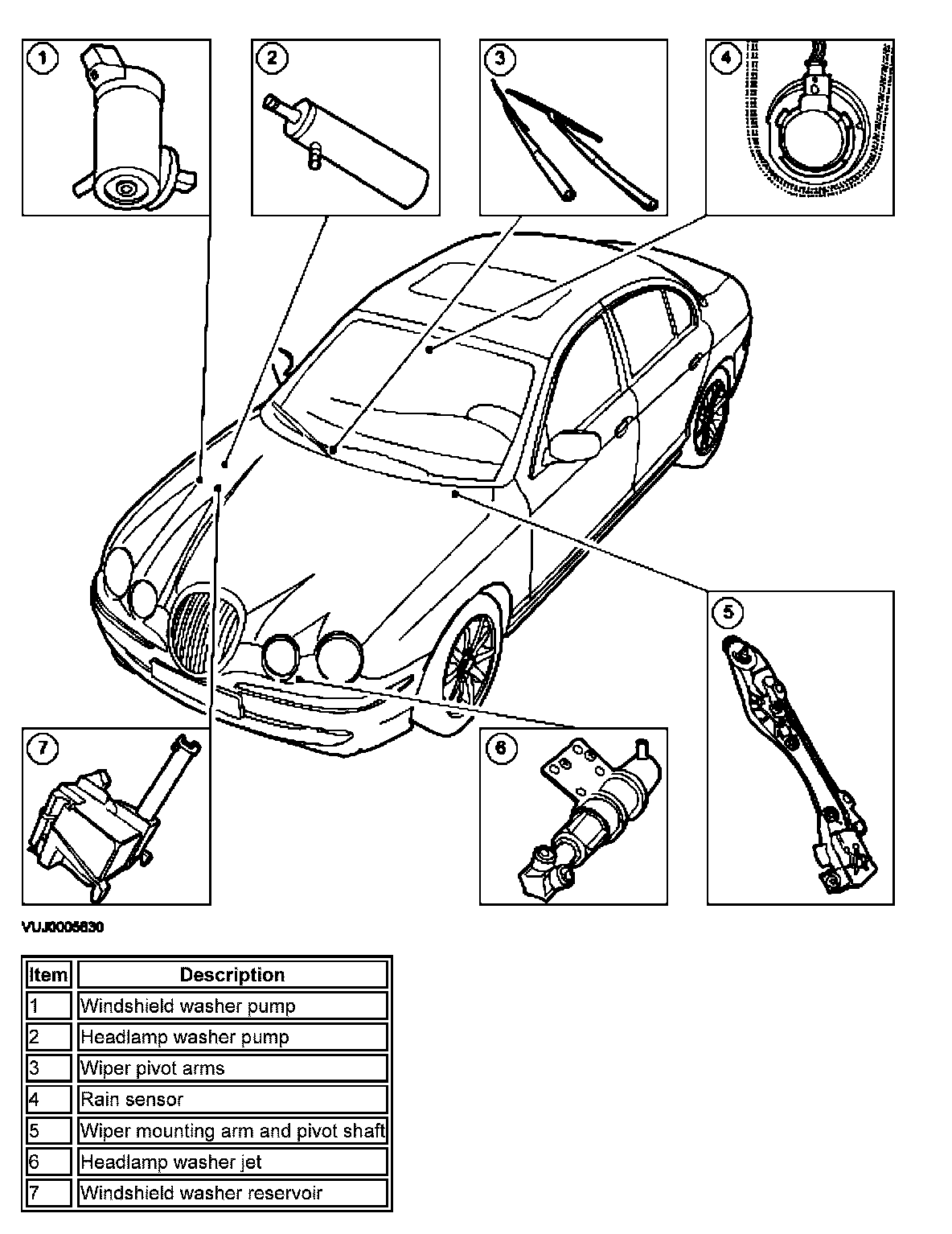 The wipers and washers system consists of the following components: wipers and washers, mounting arm and pivot shaft, wiper motor, washer reservoir and washer pump, a headlamp washing system is available as an additional option.