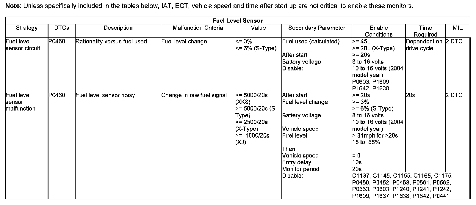 The fuel level is monitored continuously and it needs to change by more than a set percentage before a calculated amount of fuel is used. This process will operate through cumulative trips if necessary. Once the fuel level changes by the amount required the process is reset and starts again. If the fuel used threshold is reached before the fuel level changes by the required percentage, a temporary fault will be stored. A second occurrence will cause the Malfunction Indicator Lamp (MIL) to be illuminated.