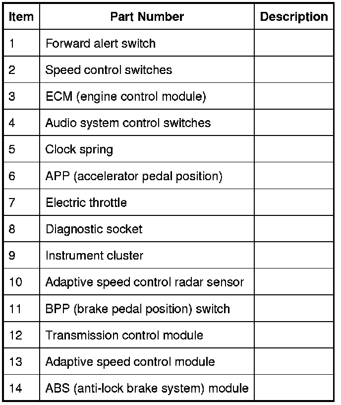 The speed control system also uses inputs from the brake pedal switch, the APP (accelerator pedal position) sensor, the ECM (engine control module) and the ABS (anti-lock brake system) control module.