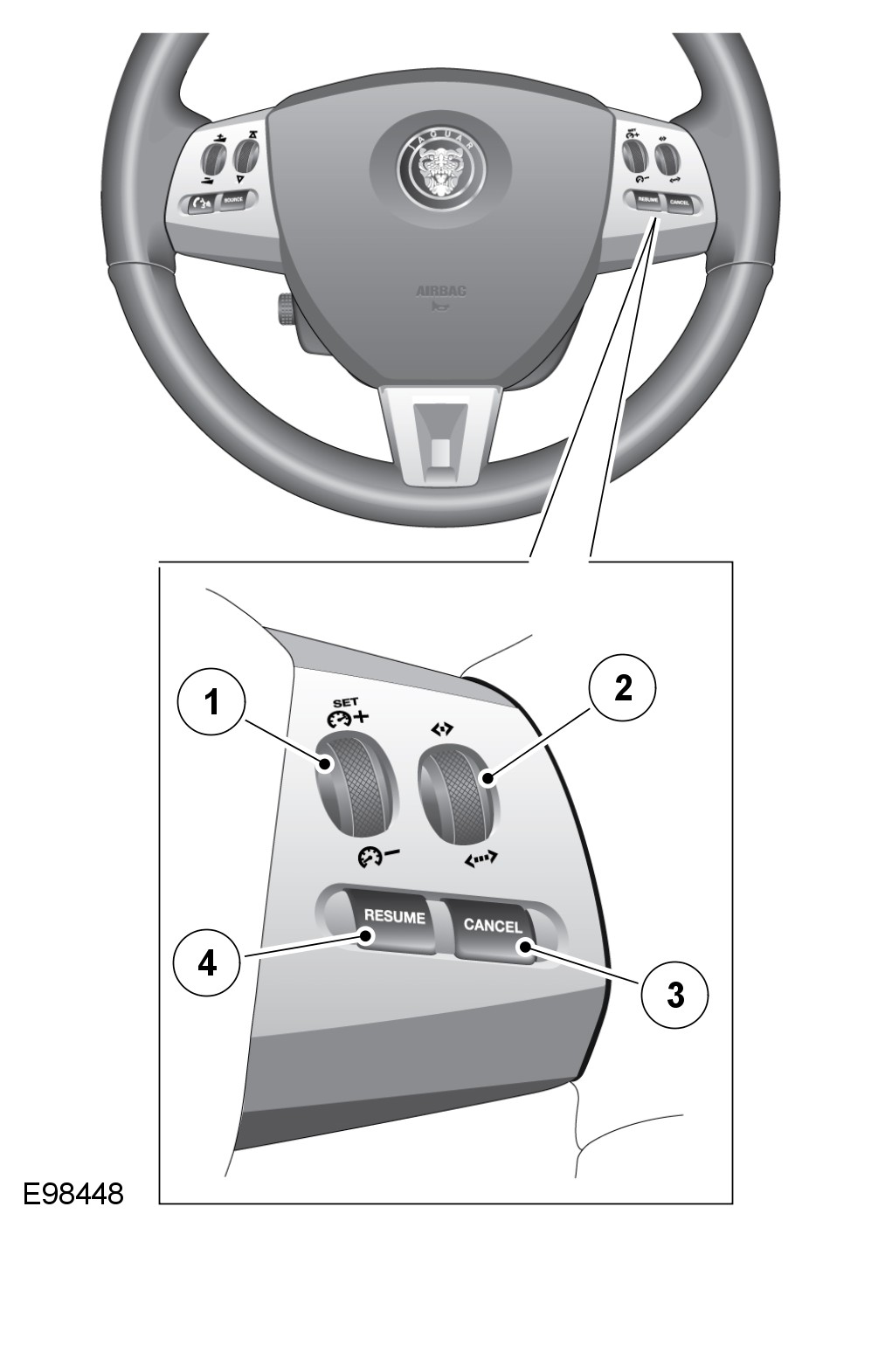 The speed control switches are located on the RH (Right-hand) side of the steering wheel. The switches are connected via fly leads to the clock spring. The speed control switches are resistive ladder type switches which vary the resistance of a 5 volt signal sent to them. The signal is returned along a Lin bus to the instrument cluster. The instrument cluster routes the control signals to the ECM (engine control module) on the MS CAN (controller area network).