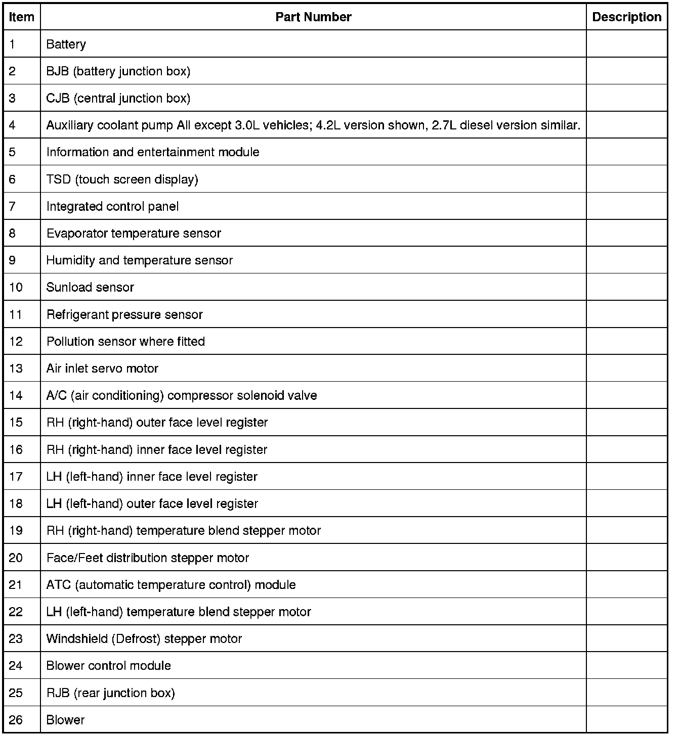 The pollution sensor is powered by an ignition controlled voltage feed from the CJB (central junction box) and provides the ATC (automatic temperature control) module with separate signals of hydrocarbon and oxidized gas levels. With a pollution sensor fitted, the ATC (automatic temperature control) module can control the air inlet source to reduce the amount of contaminants entering the passenger compartment. This function is fully automatic, but can be overridden by manual selection of the air source using the recirculation switch on the integrated control panel.