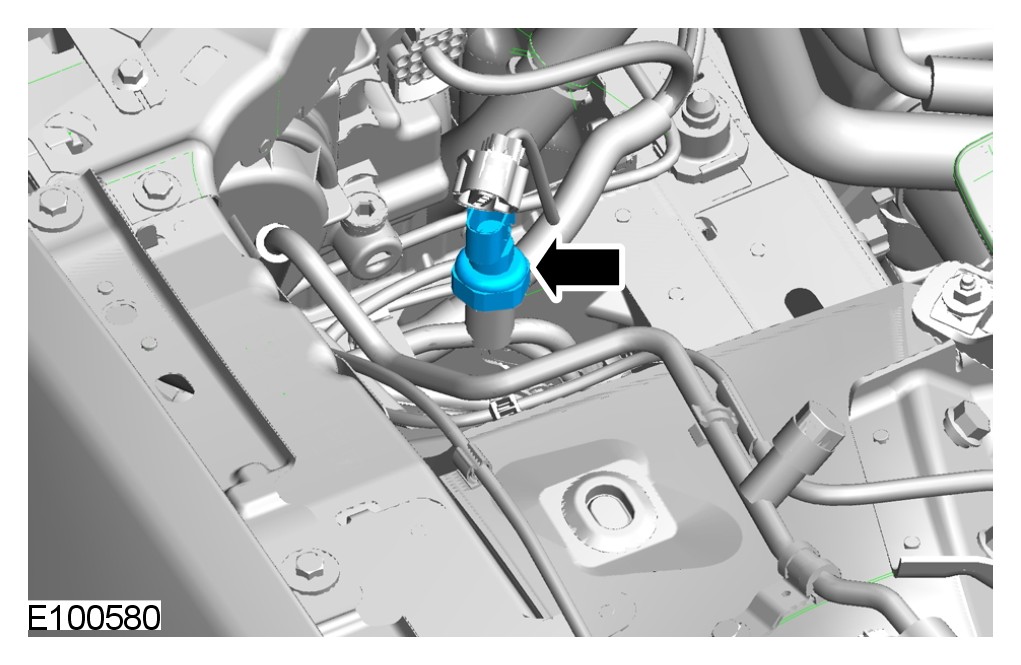 CAUTION: Make sure the air conditioning (A/C) hose does not turn when removing the low pressure switch.