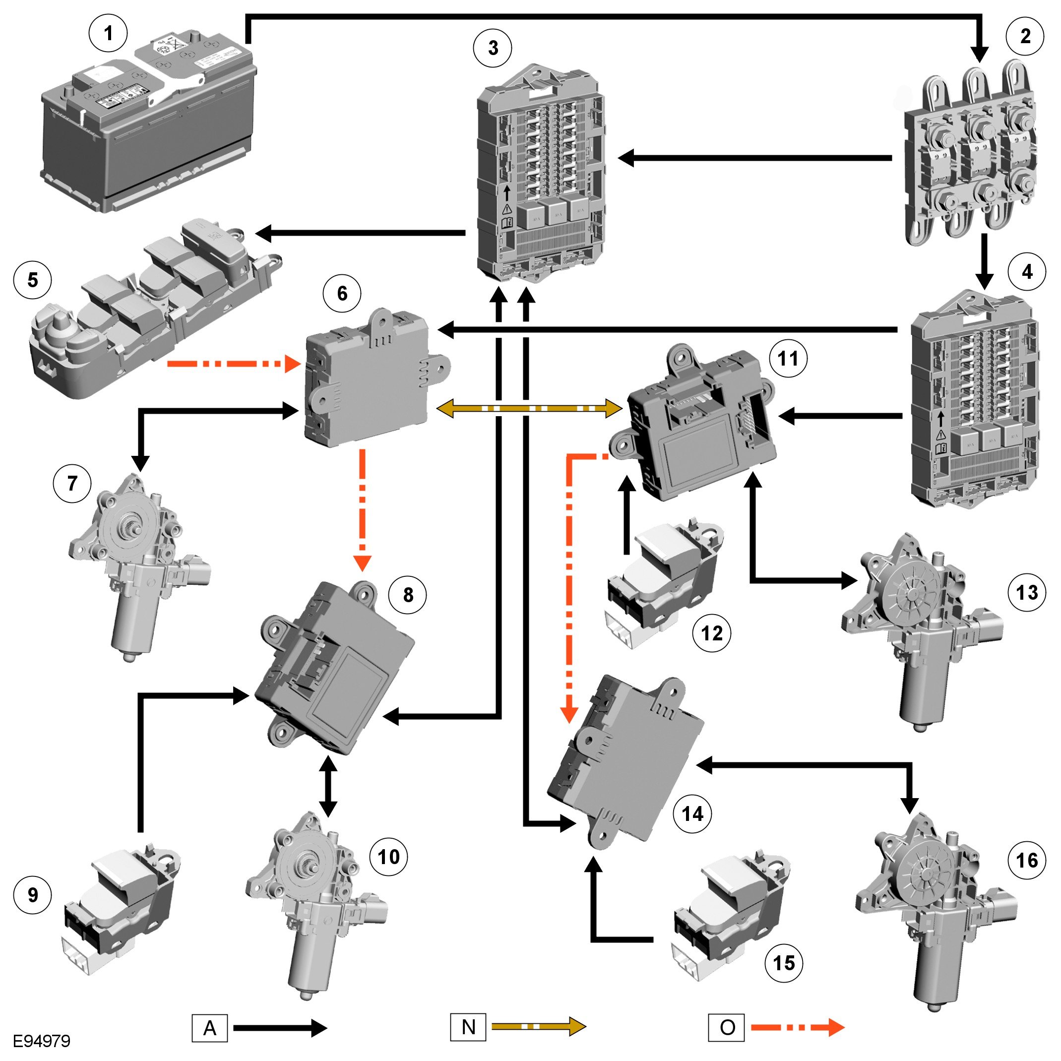 Electric window operation is enabled while the ignition is in power mode 4 and 6. When the switches in the driver's door are used to operate the passenger windows, the driver's door module outputs a related message on the LIN (local interconnect network) bus and medium speed CAN (controller area network) bus. The passenger door module responds to the message by operating the appropriate window. When the child lock is engaged, the rear door modules ignore inputs from the rear window switches.