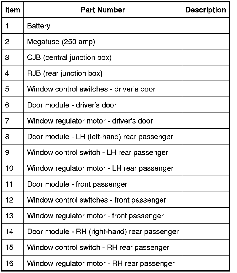 All windows can be operated individually, or by the driver's window control switch. The operation of the windows is proportional to the switch activation. The driver window can be controlled by 'one touch' in an upward or downward direction. When the 'one touch' operation is activated in the upwards direction an anti-trap sensor is automatically checked prior to the window closing. If the anti-trap sensor is inoperative the window will not close. When the anti-trap sensor detects an obstacle in the window's path, the upward travel of the window will automatically cease. Downward travel of the window will begin and then stop when a preset time has elapsed.