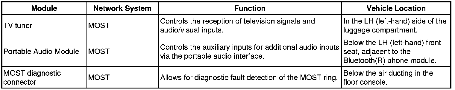 The following table shows each vehicle control module, the network system to which it is connected, its function and location in the vehicle.