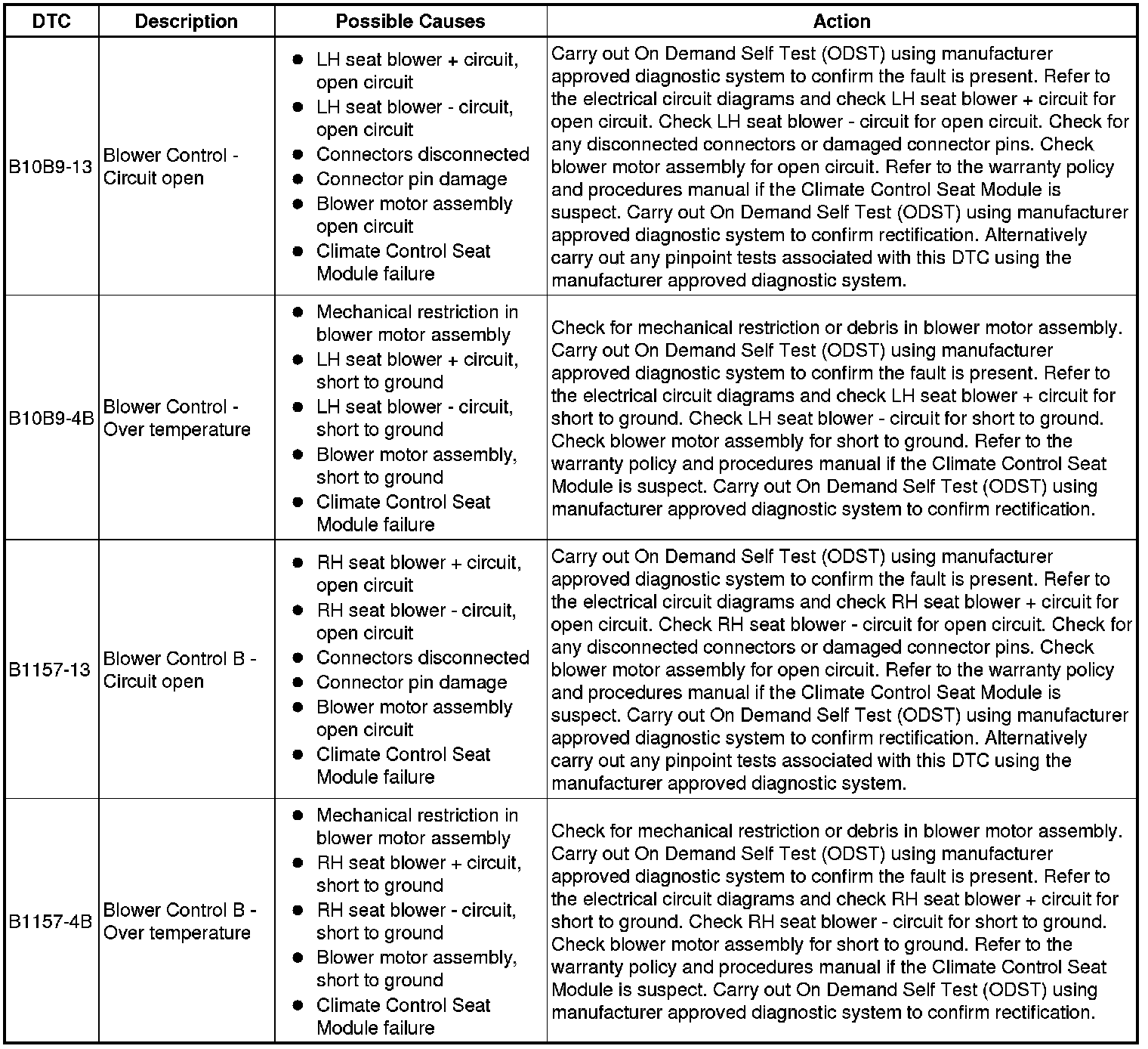 The table below lists all Diagnostic Trouble Codes (DTCs) that could be logged in the Climate Controlled Seat Module - Front/Rear (SCME/SCMF), for additional Diagnosis and Testing information refer to the relevant Diagnosis and Testing Section. For additional information, refer to Seats Initial Inspection and Diagnostic Overview