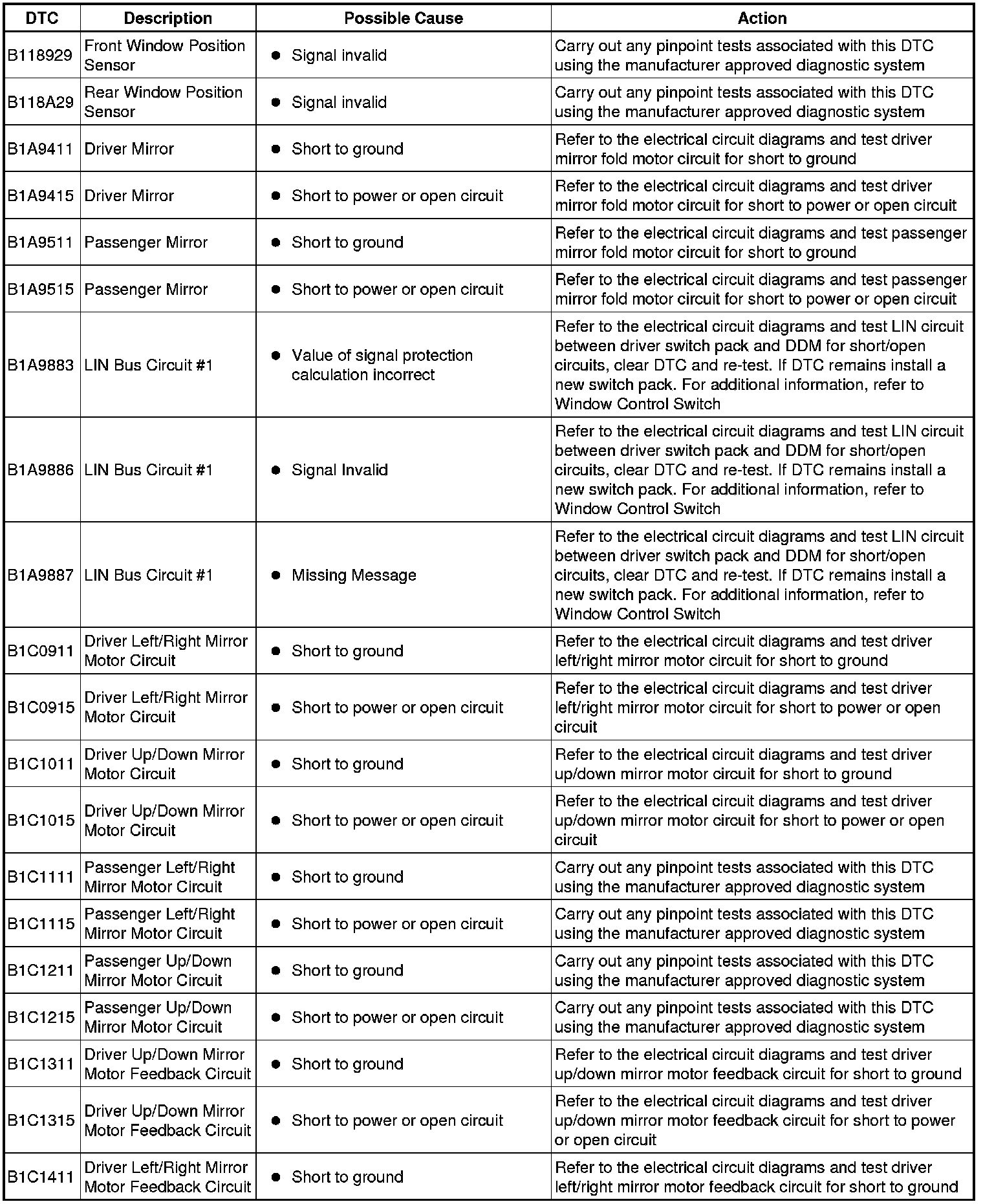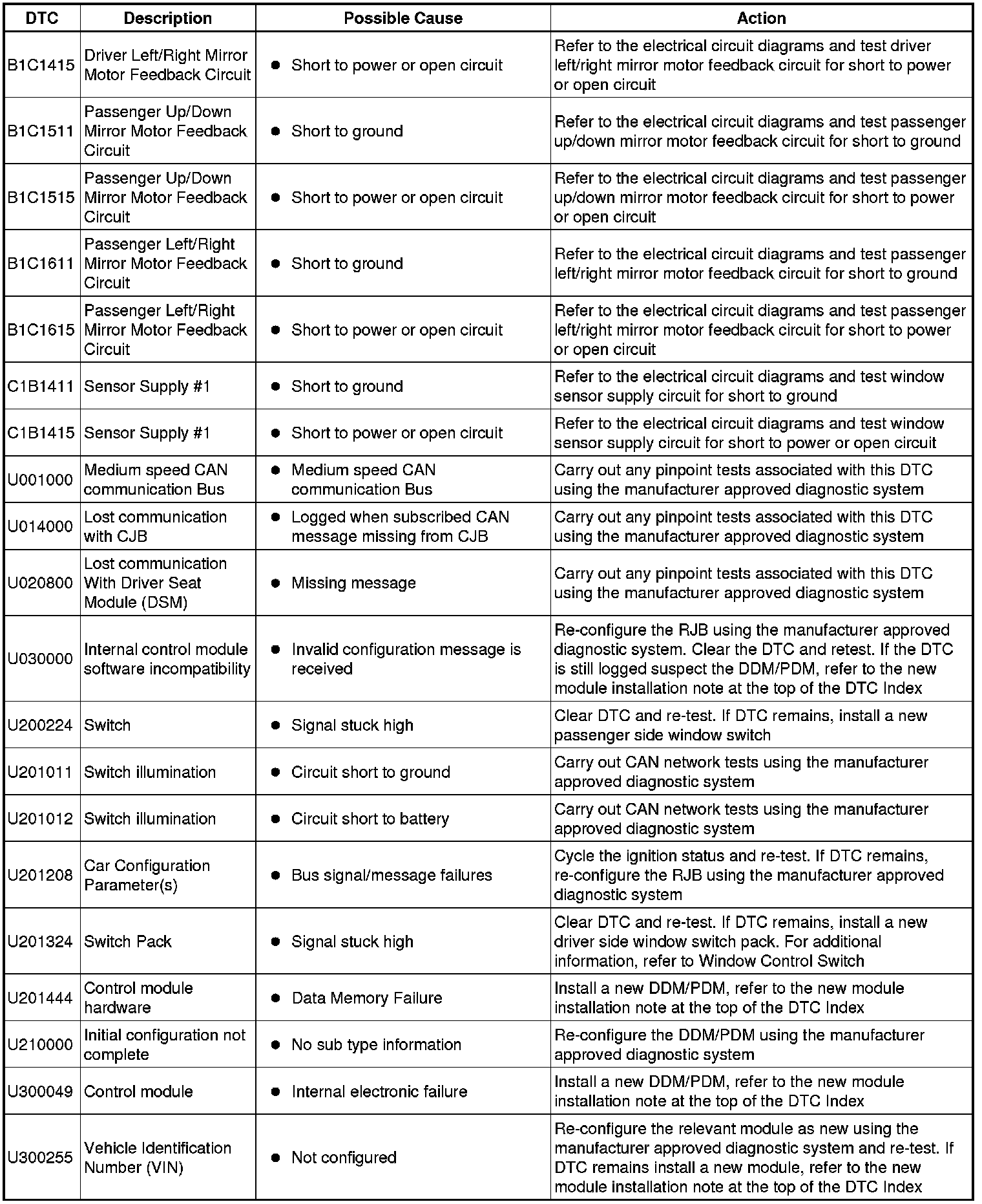 The DTC Index shows information for DTCs that could be logged in the Driver Door Module (DDM) or Passenger Door Module (PDM). For diagnosis and testing information for: Driver/Passenger Seat module. For additional information, refer to Seats Initial Inspection and Diagnostic Overview Information and Entertainment module. For additional information, refer to Audio System Initial Inspection and Diagnostic Overview Remote Keyless Entry module. For additional information, refer to Locks, Latches and Entry Systems Testing and Inspection