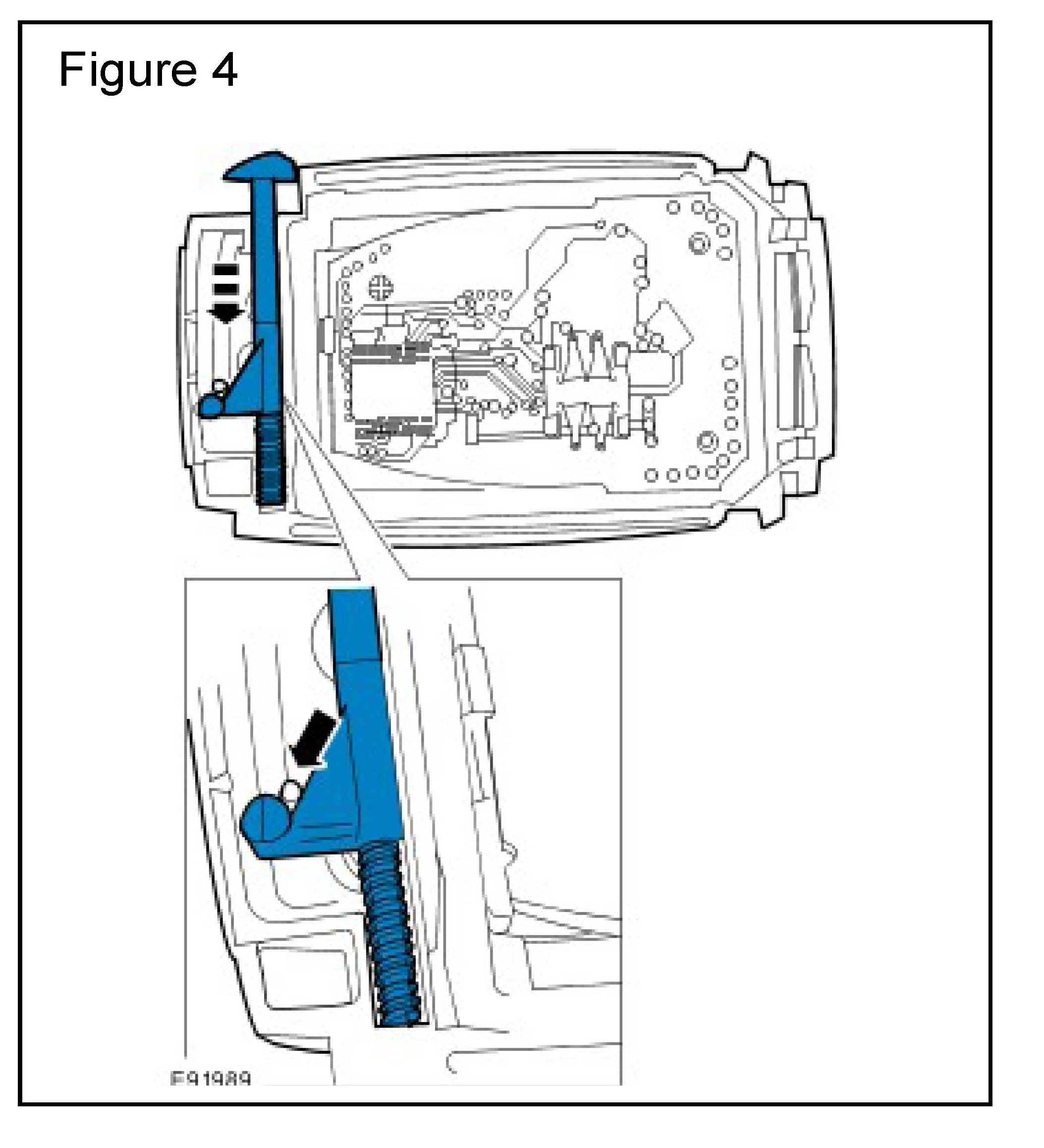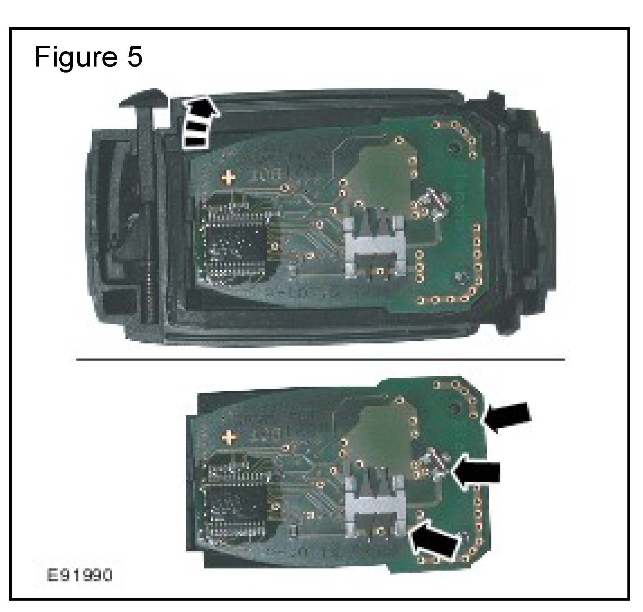 The green printed circuit board, battery or the battery contacts (arrowed in Figure 3) may NOT be touched during the work procedure. Oil or contamination on either can affect the key fob performance.