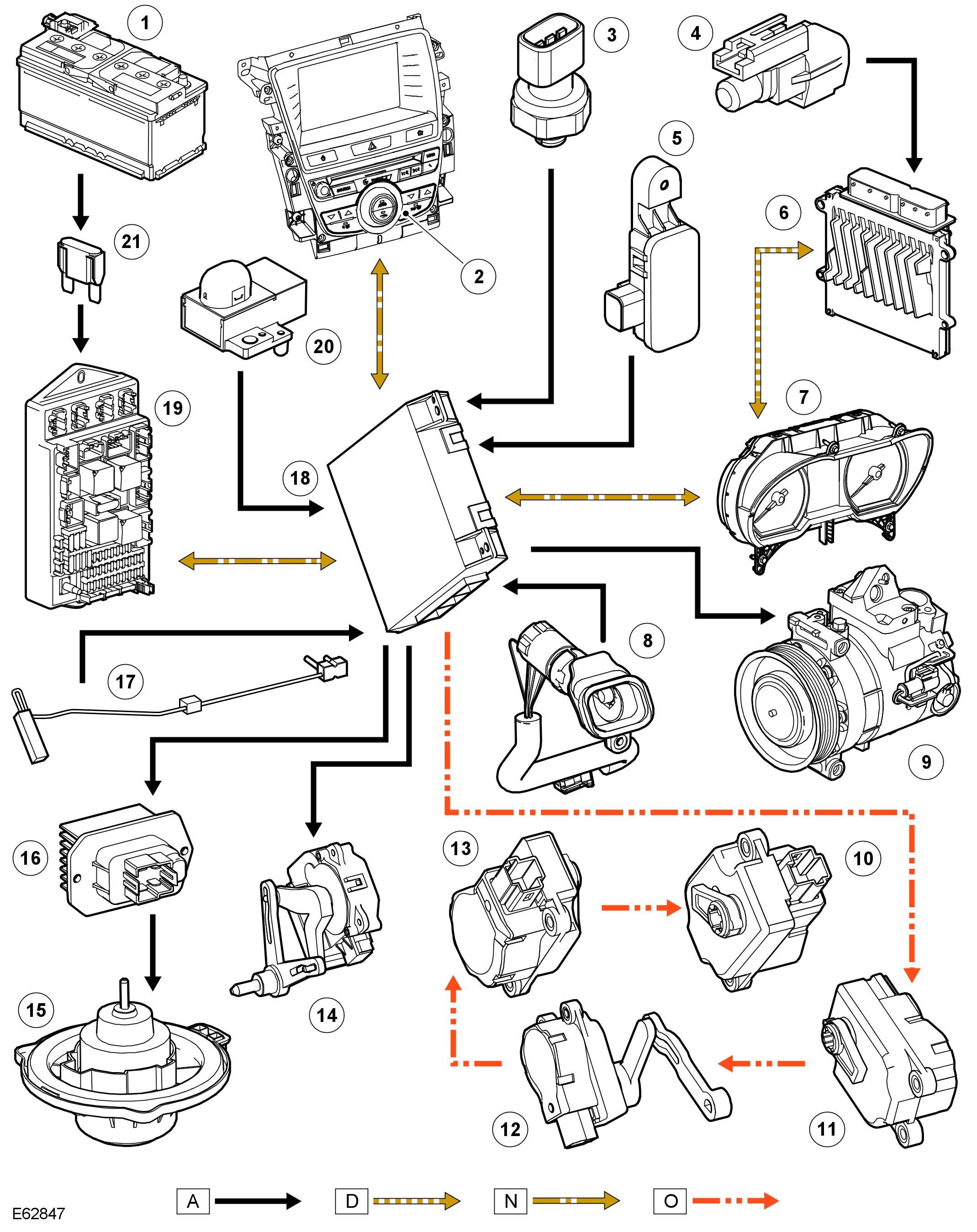 Operation of the blower motor is controlled by the ATC (automatic temperature control) module. The ATC (automatic temperature control) module monitors a feedback voltage from the blower motor control module. In response to the feedback voltage, the ATC (automatic temperature control) module provides a drive signal back to the blower motor control module which is used to regulate the voltage flow across the blower motor and hence regulate blower speed. The blower motor is provided with a battery voltage feed from the blower motor relay, which is located within the auxiliary junction box.