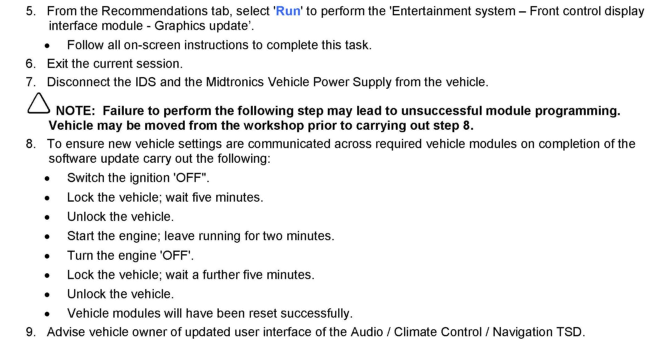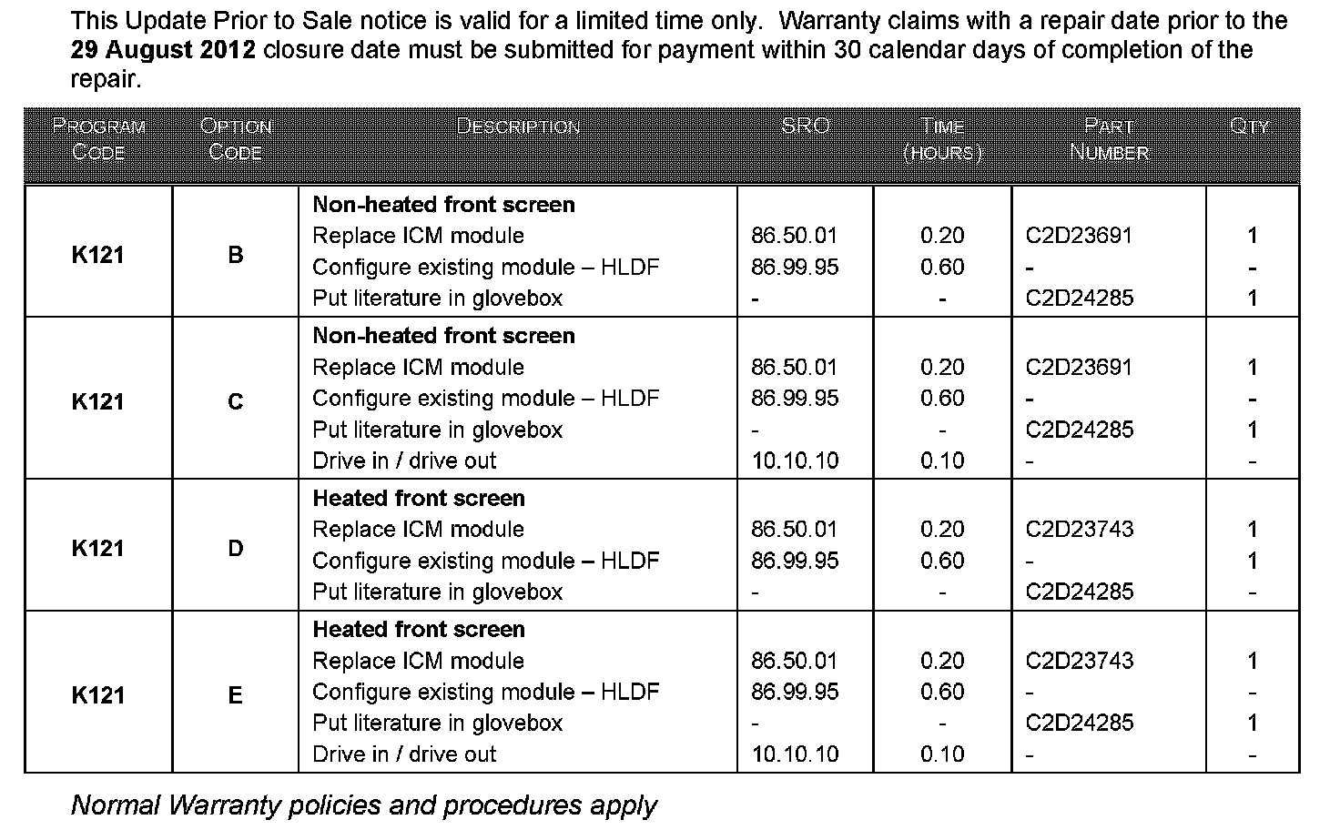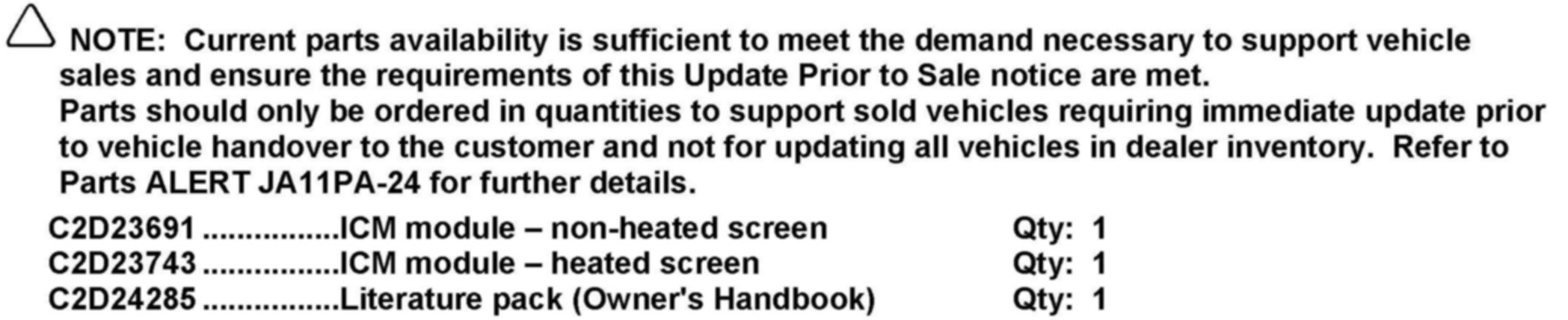 Dealers are required to HOLD the affected vehicles within your control and refrain from releasing the vehicles for new or used vehicle sale pending completion of the rework action detailed in this Technical Bulletin. For vehicles in dealer inventory, this UPS should be performed after the Pre-Delivery Inspection (PDI) has been completed and prior to final preparation / customer handover. For those vehicles already in the hands of customers, this should be done at the next available service visit.