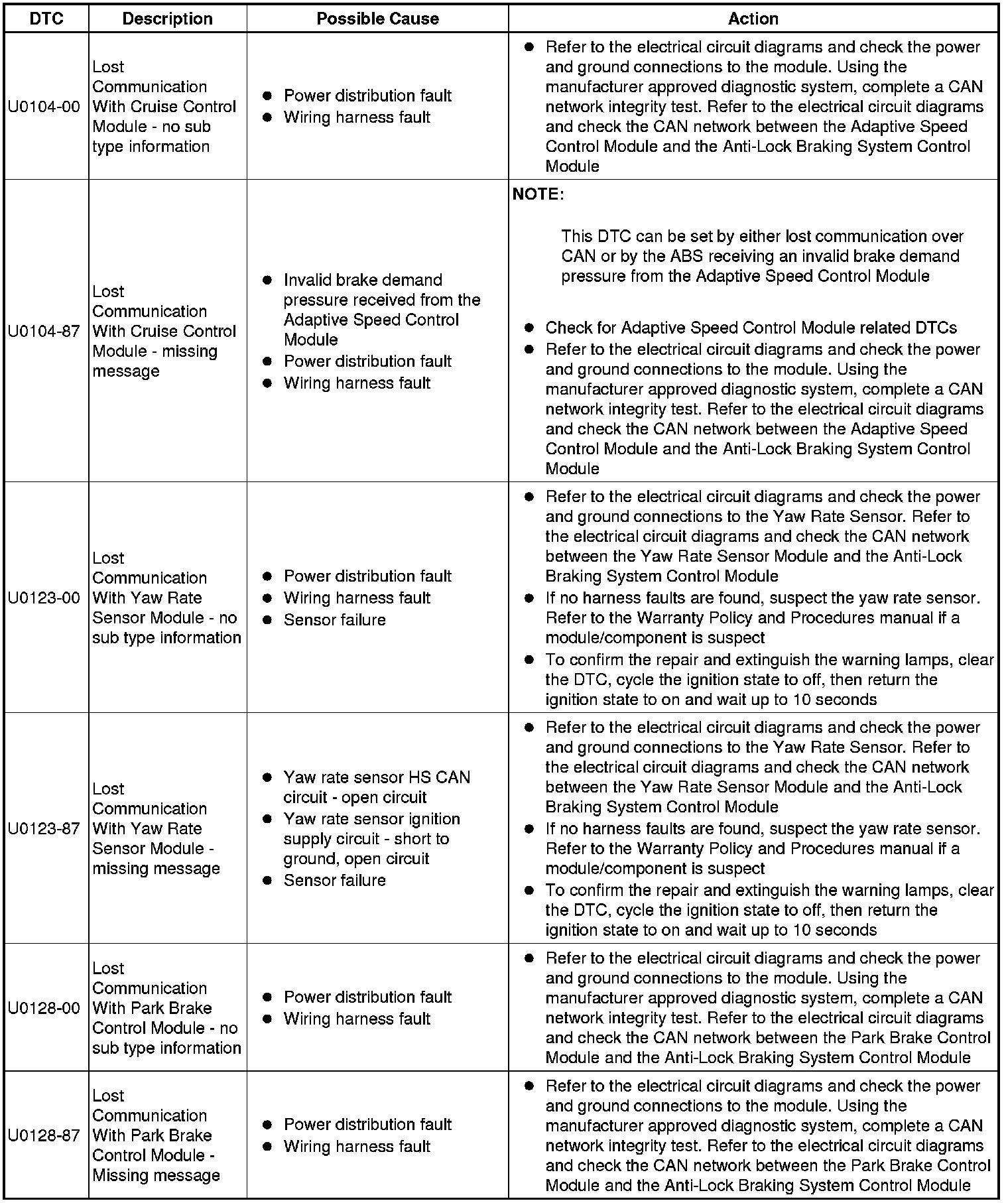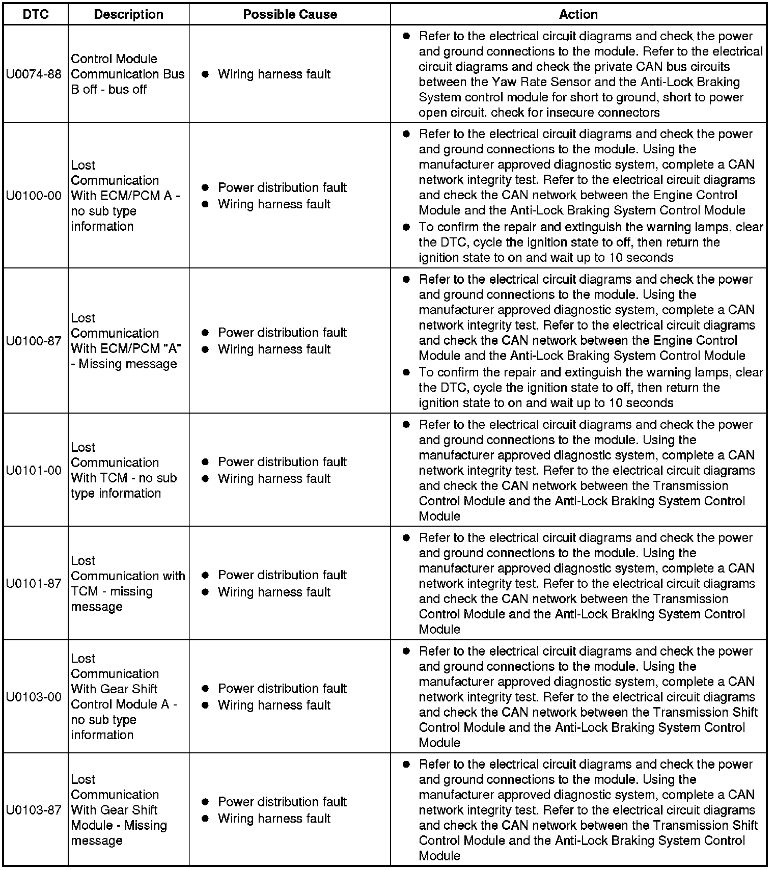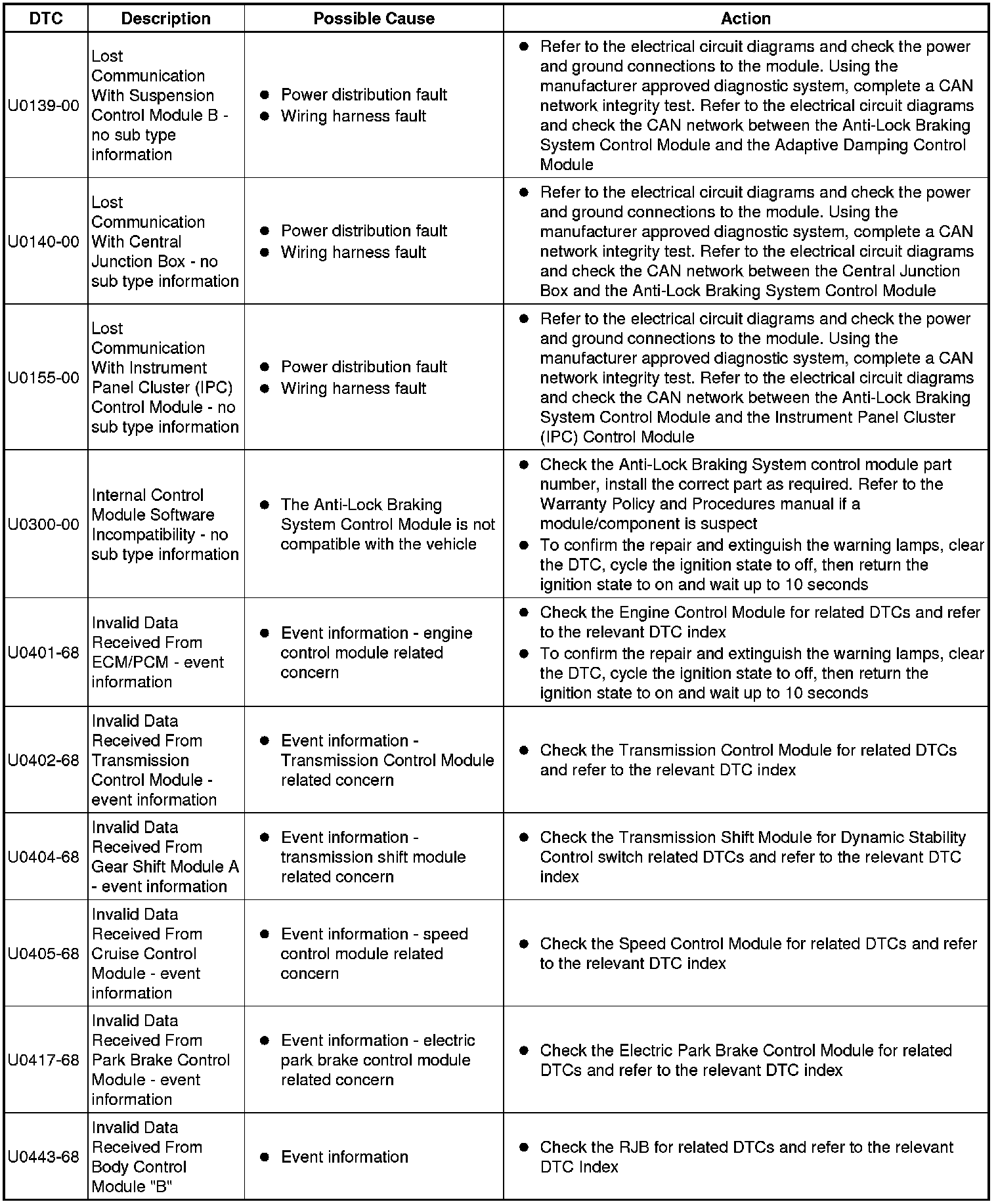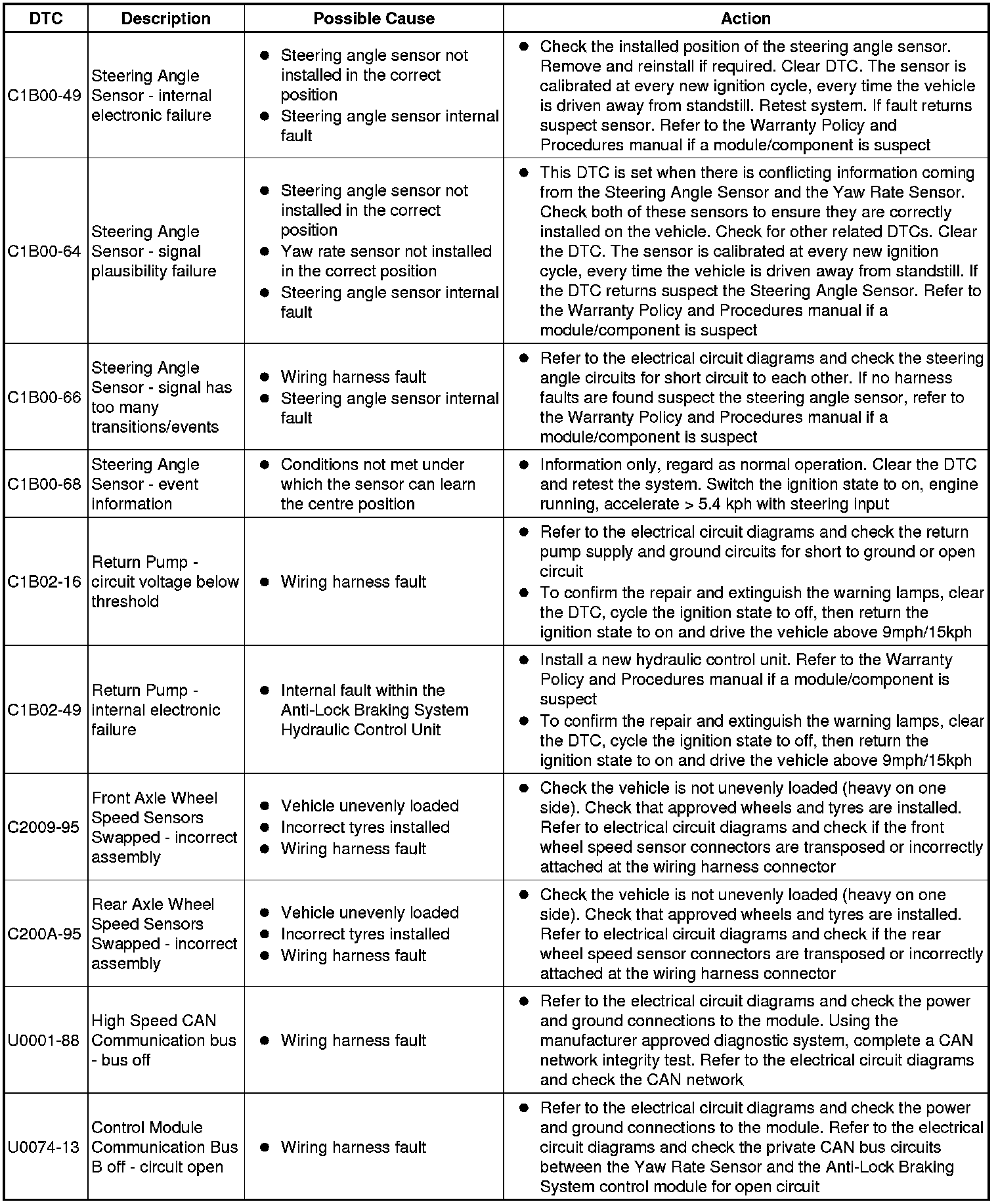 The table below lists all Diagnostic Trouble Codes (DTCs) that could be logged in the Anti-Lock Braking System module, for additional Diagnosis and Testing information refer to the relevant Diagnosis and Testing Section. For additional information, refer to Anti-Lock Control - Stability Assist Initial Inspection and Diagnostic Overview