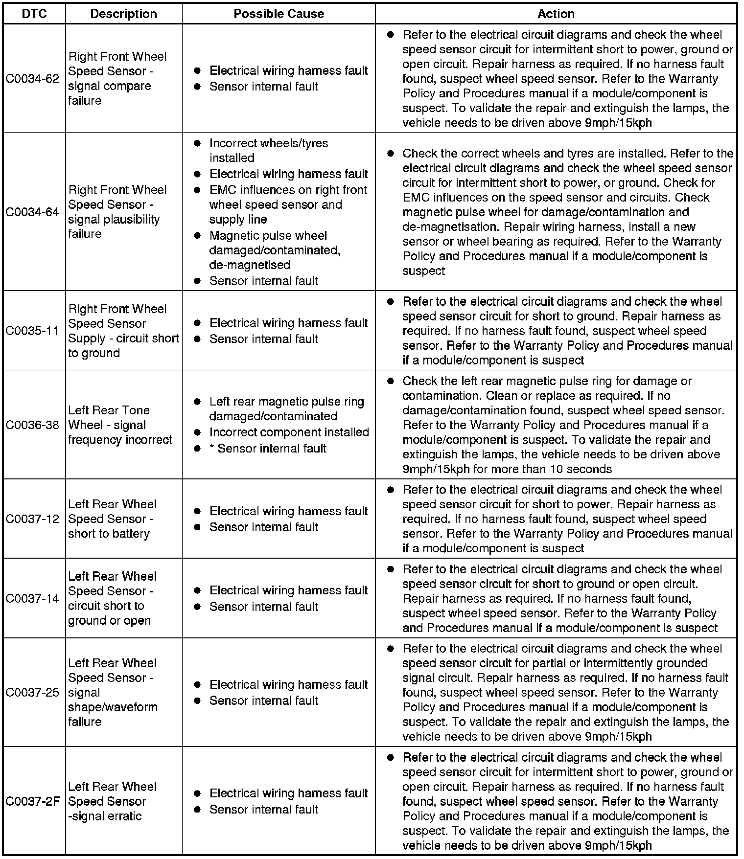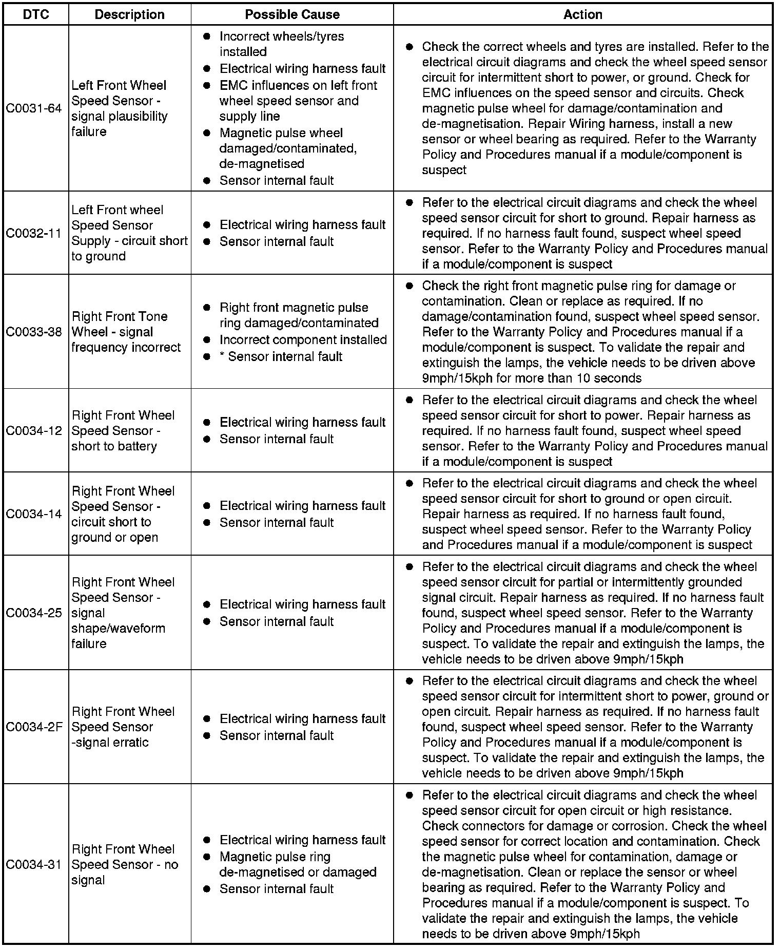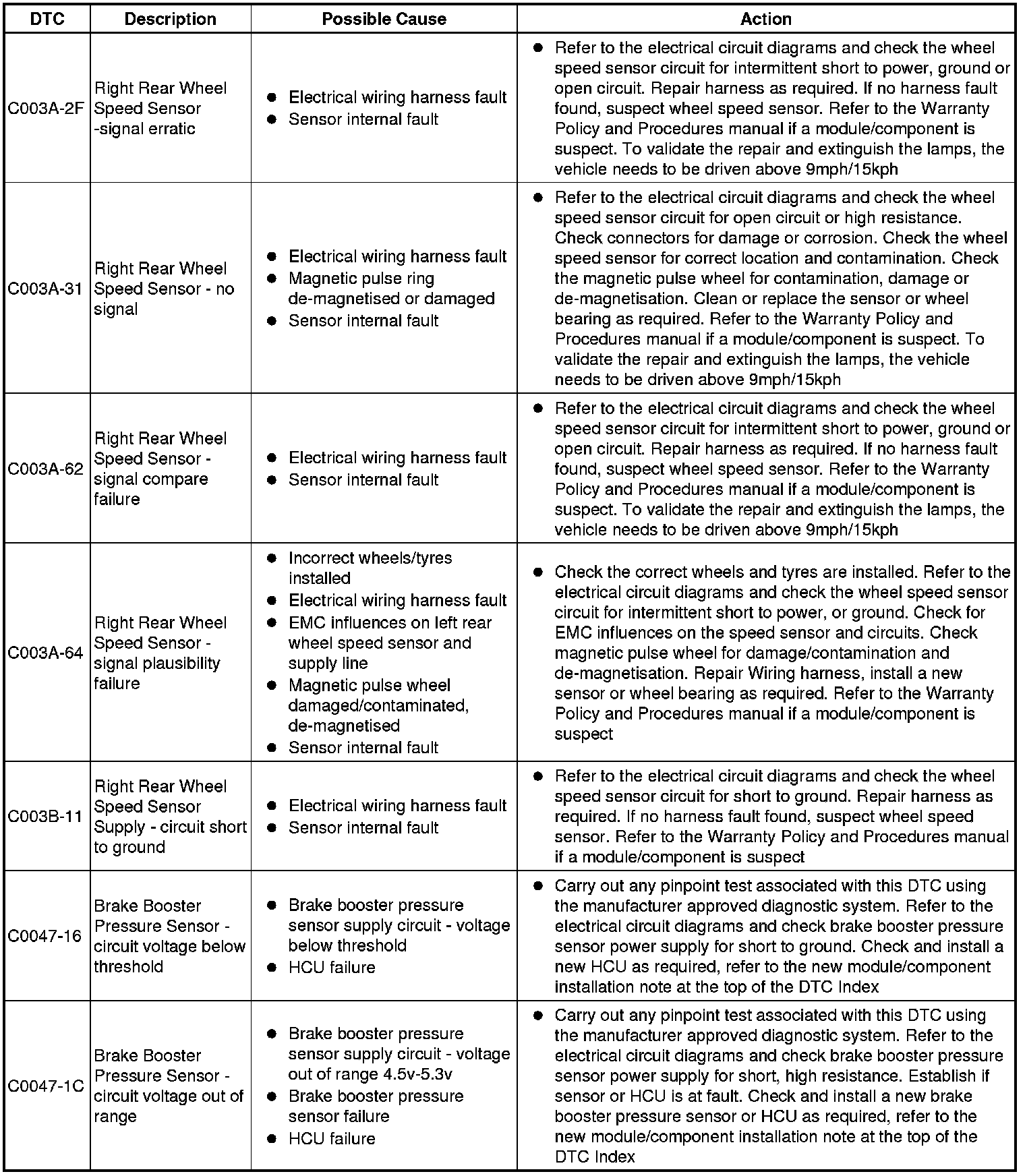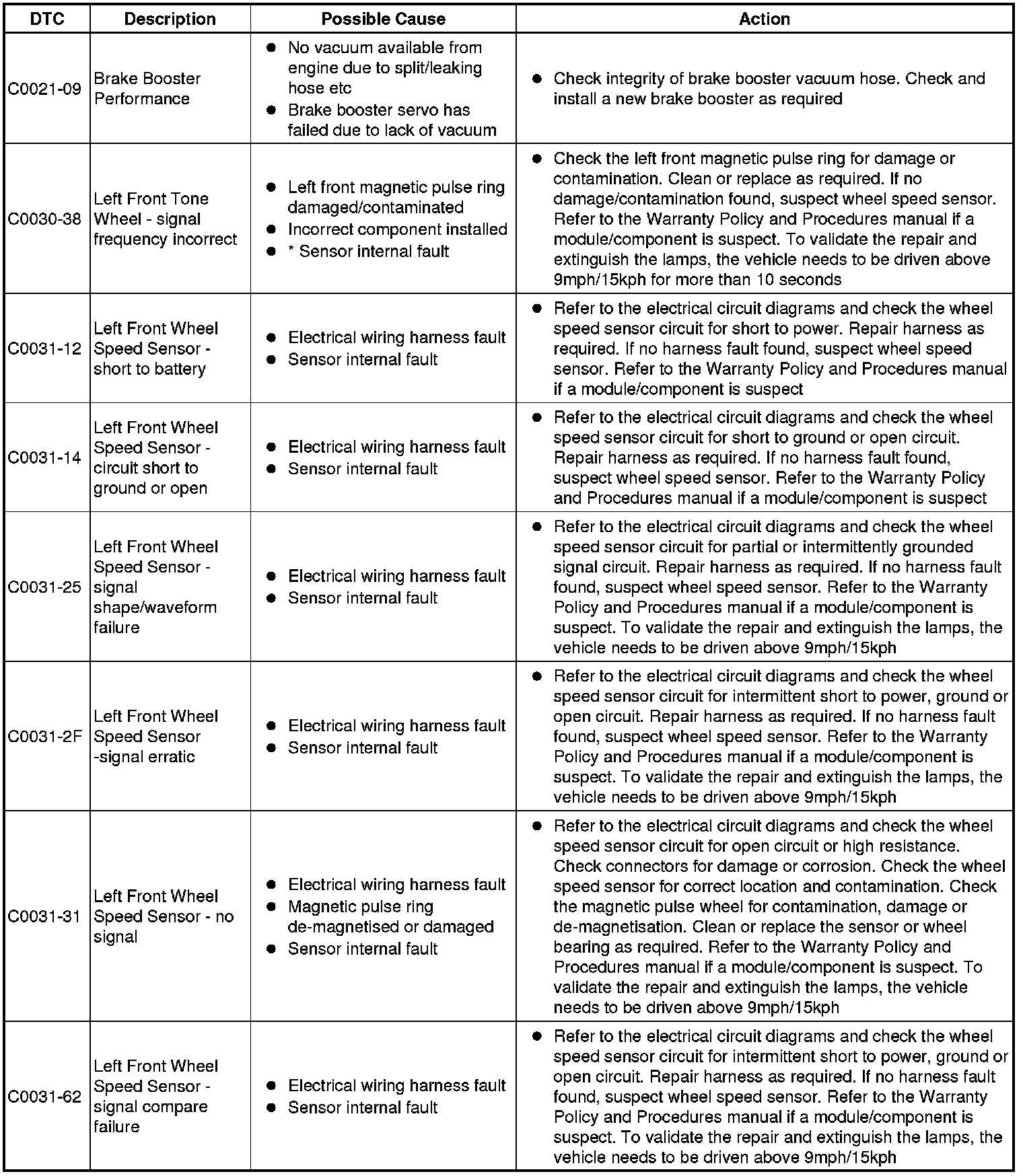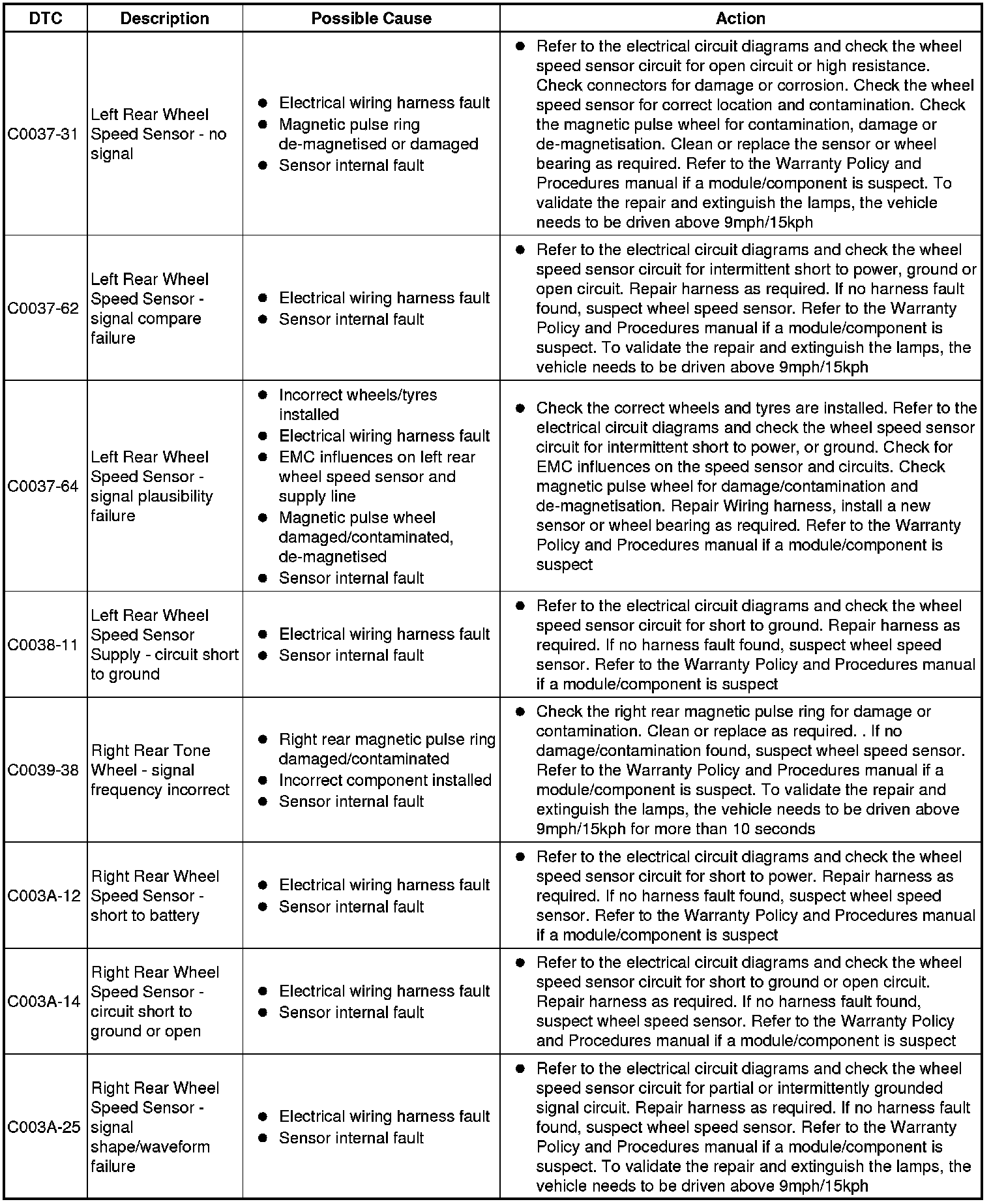 The table below lists all Diagnostic Trouble Codes (DTCs) that could be logged in the Anti-Lock Braking System module, for additional Diagnosis and Testing information refer to the relevant Diagnosis and Testing Section. For additional information, refer to Anti-Lock Control - Stability Assist Initial Inspection and Diagnostic Overview