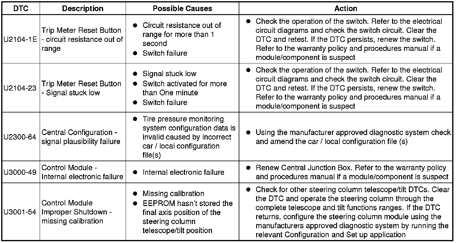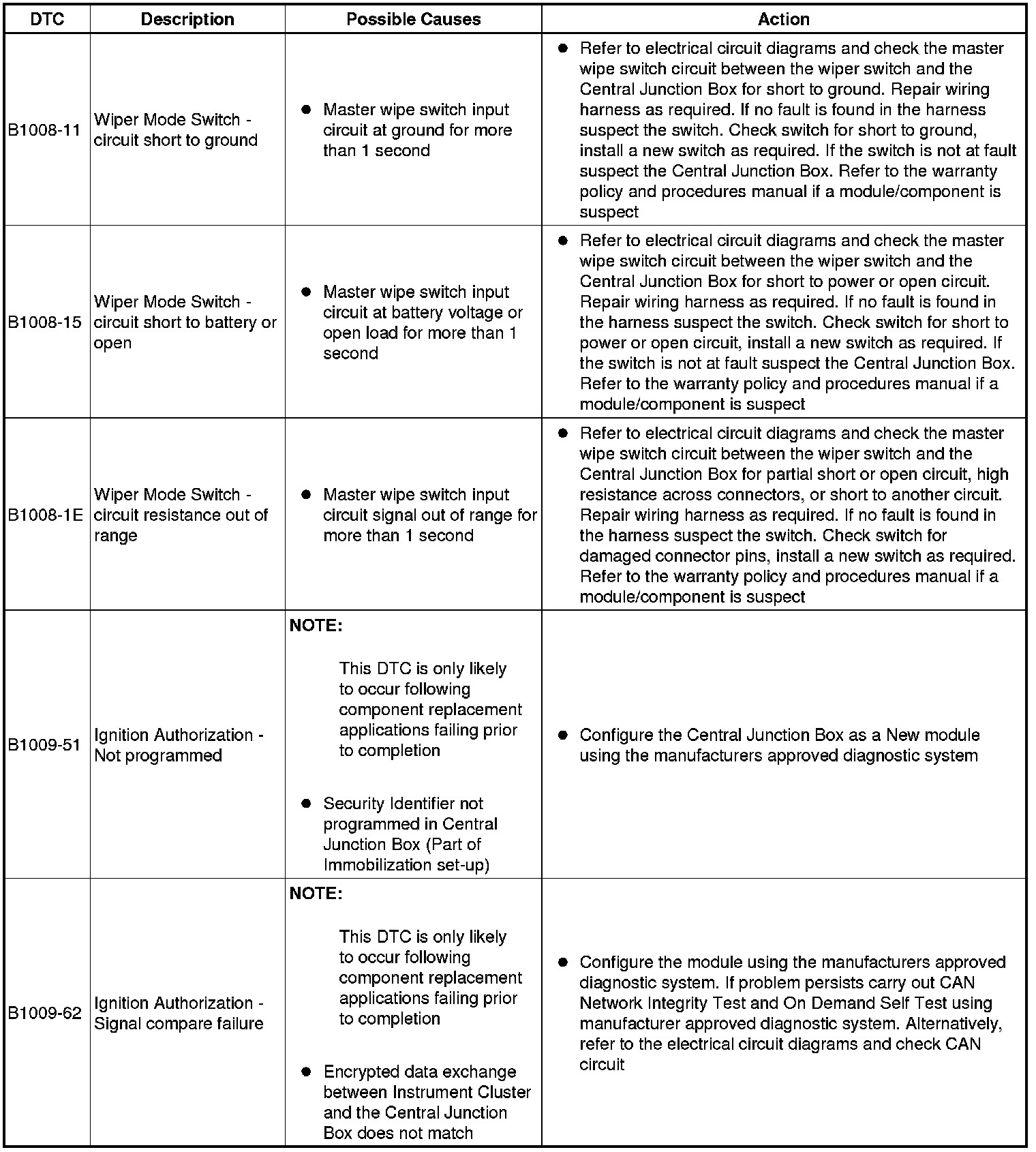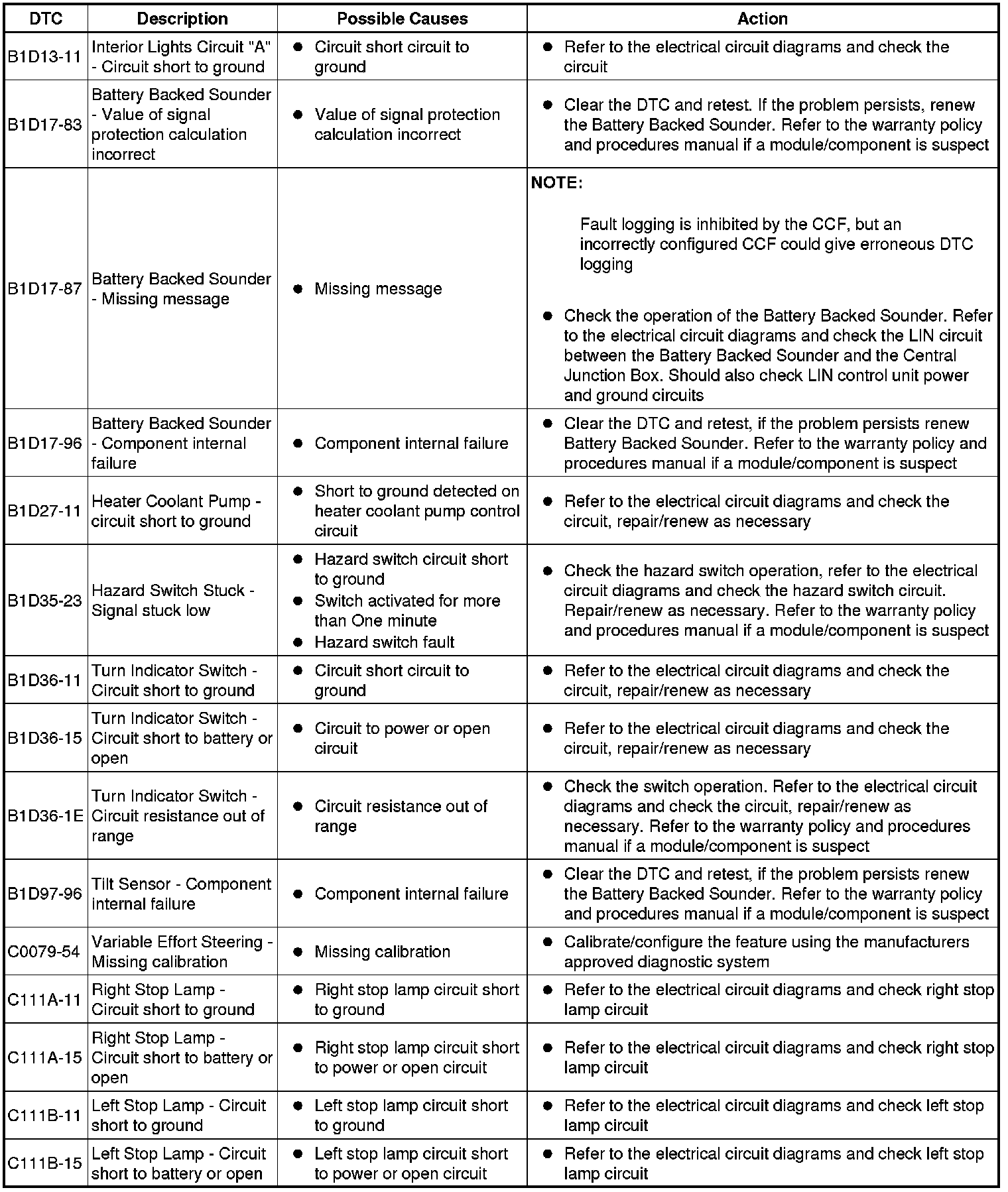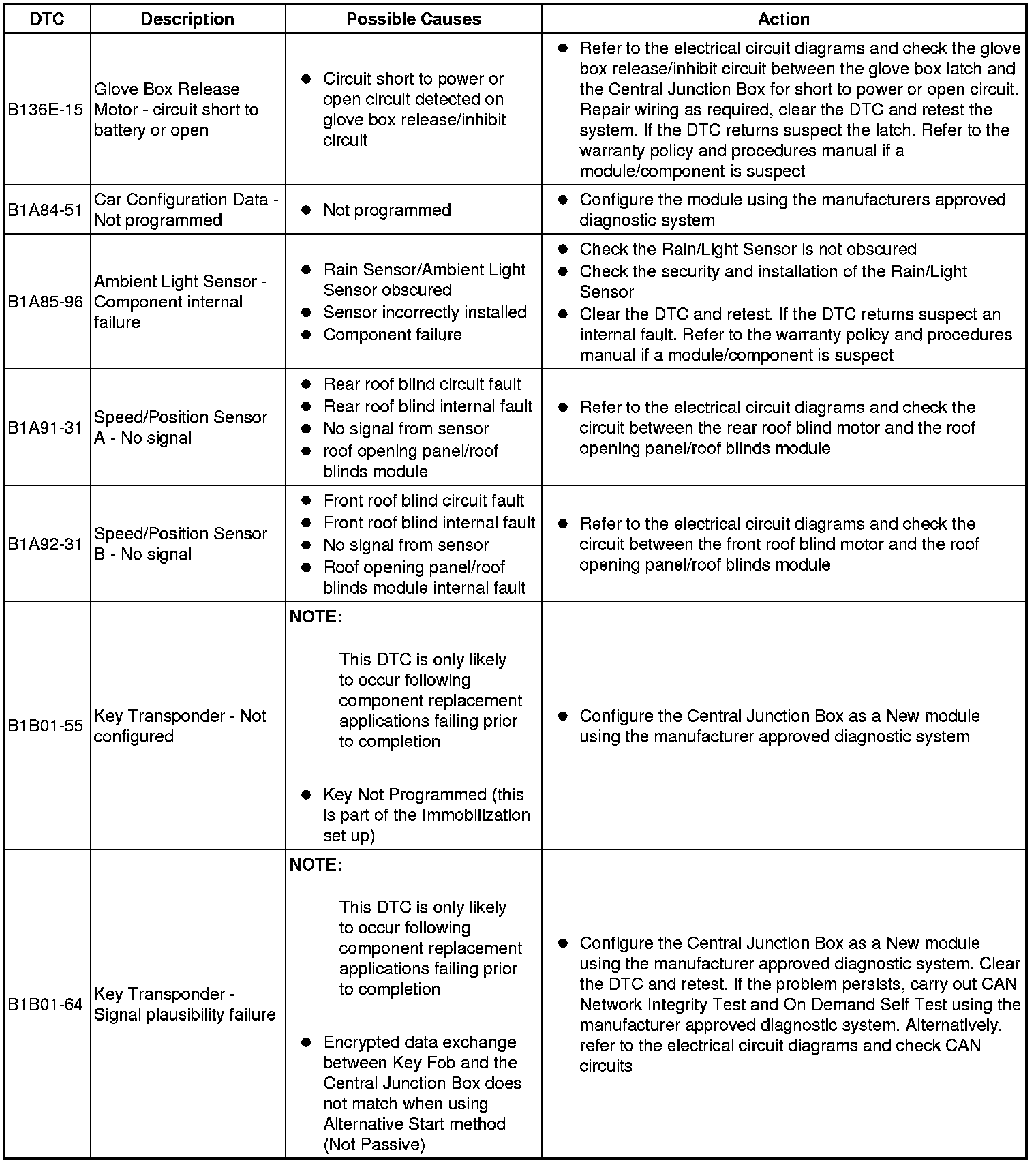 The table below lists all Diagnostic Trouble Codes (DTCs) that could be logged in the Central Junction Box, for additional Diagnosis and Testing information refer to the relevant Diagnosis and Testing Section. For additional information, refer to Communications Network Testing and Inspection