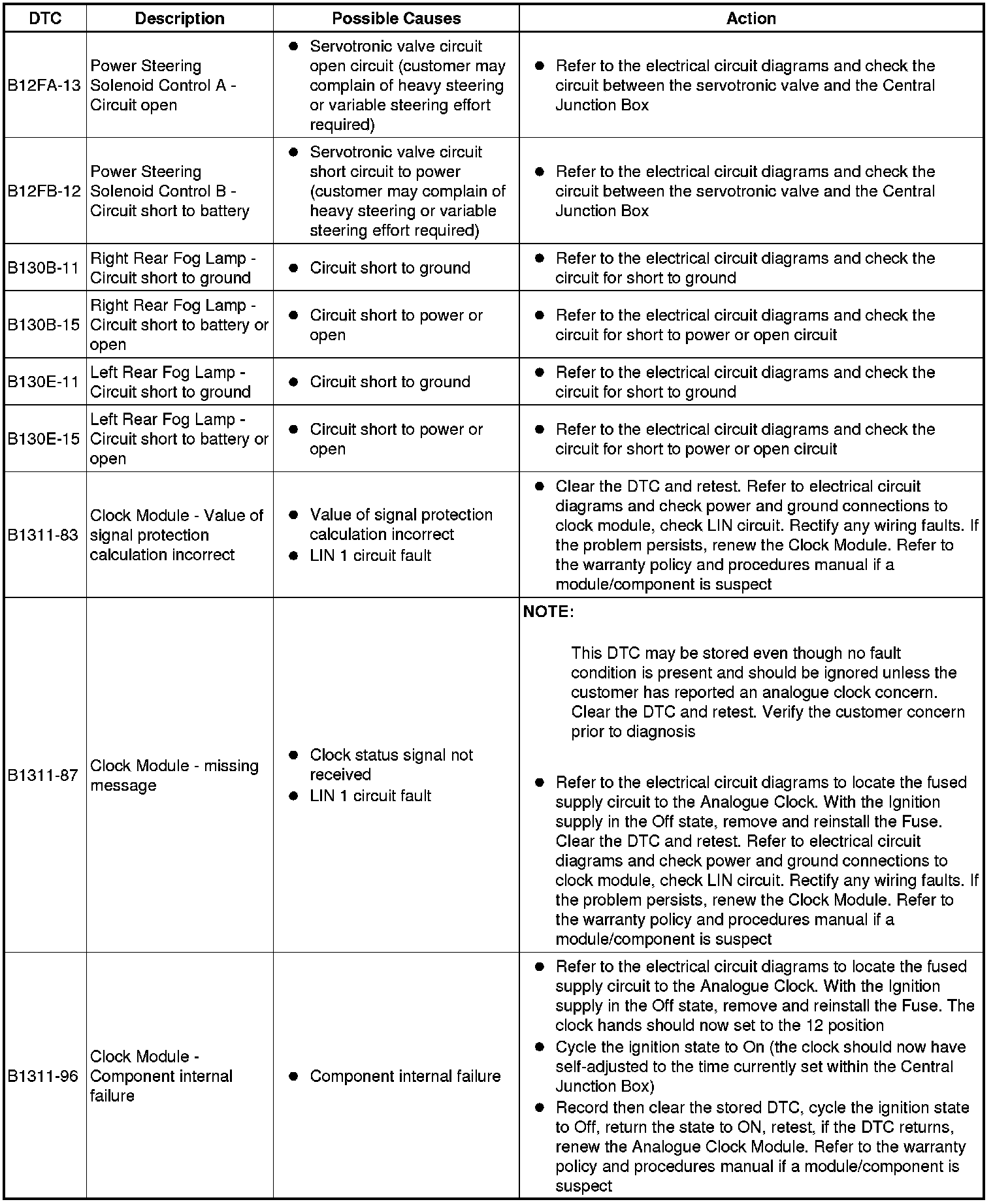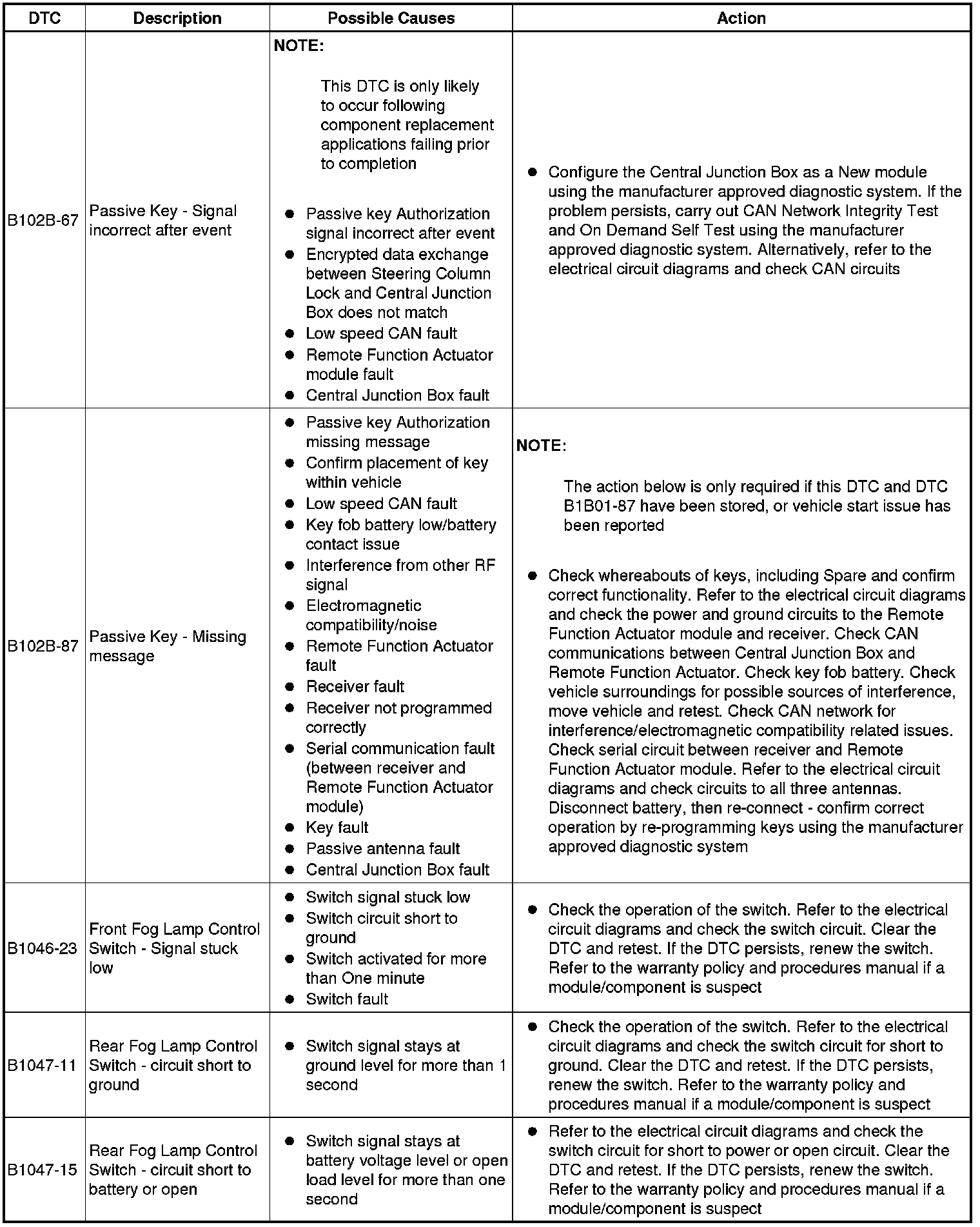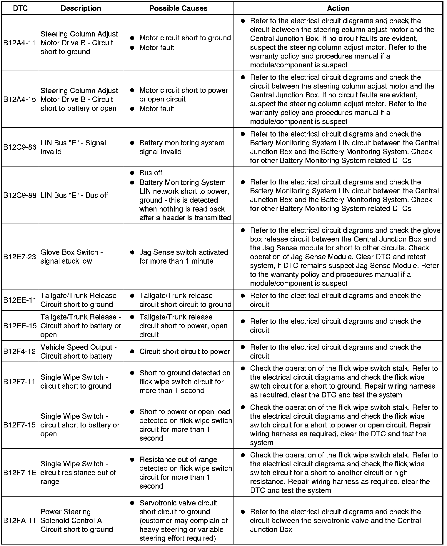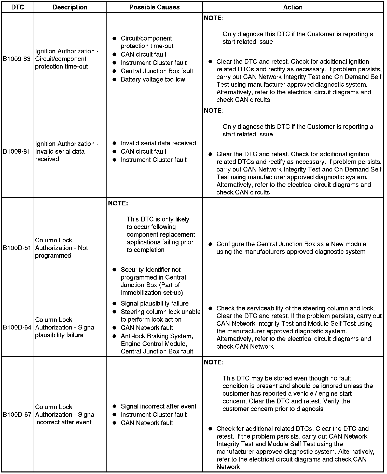 The table below lists all Diagnostic Trouble Codes (DTCs) that could be logged in the Central Junction Box, for additional Diagnosis and Testing information refer to the relevant Diagnosis and Testing Section. For additional information, refer to Communications Network Testing and Inspection