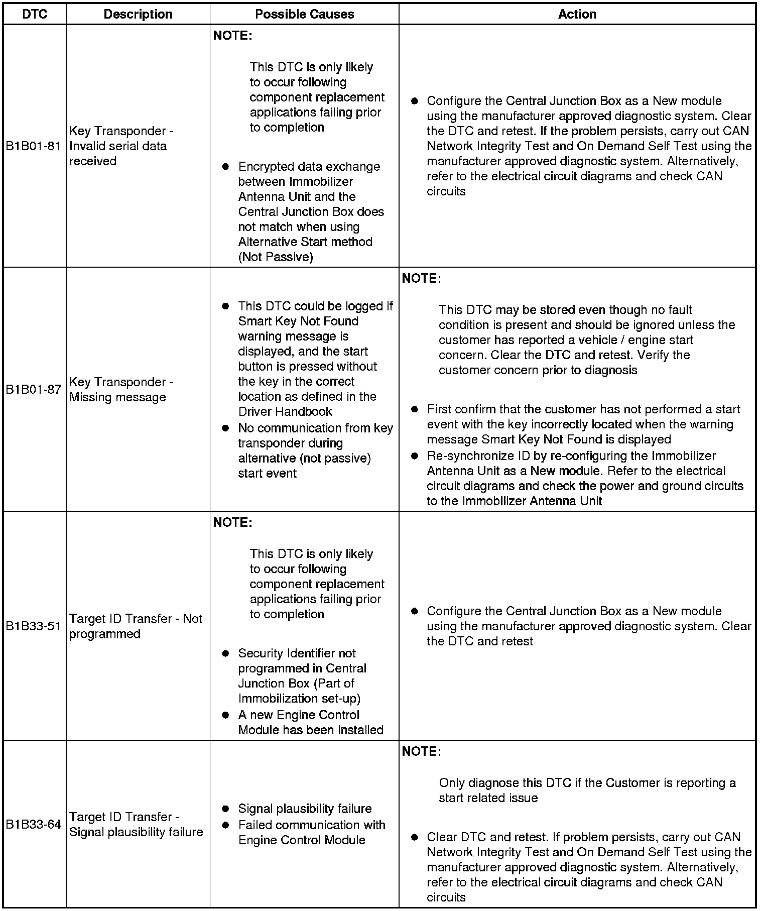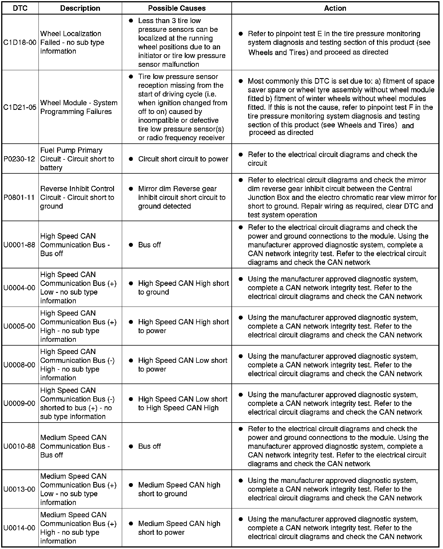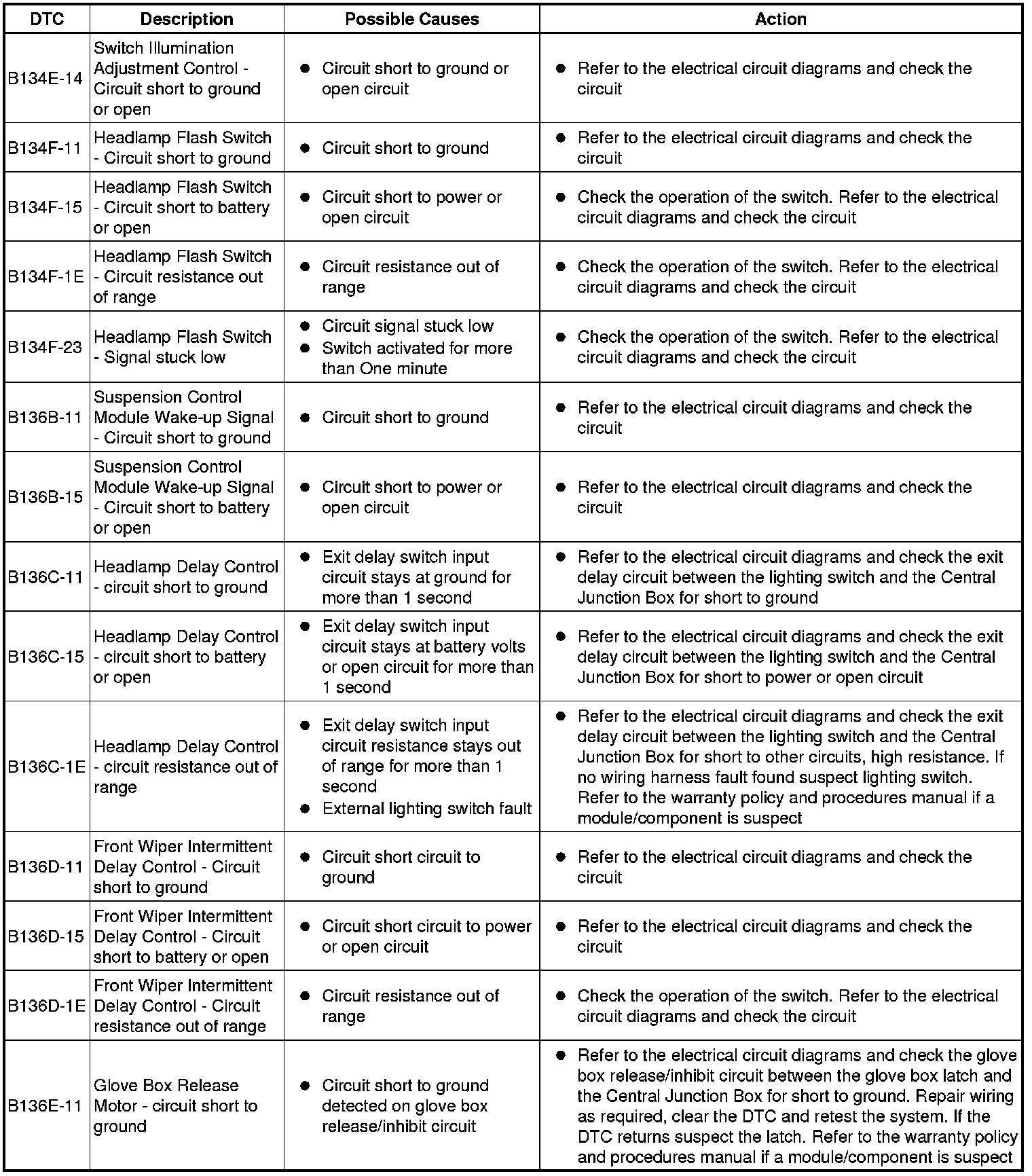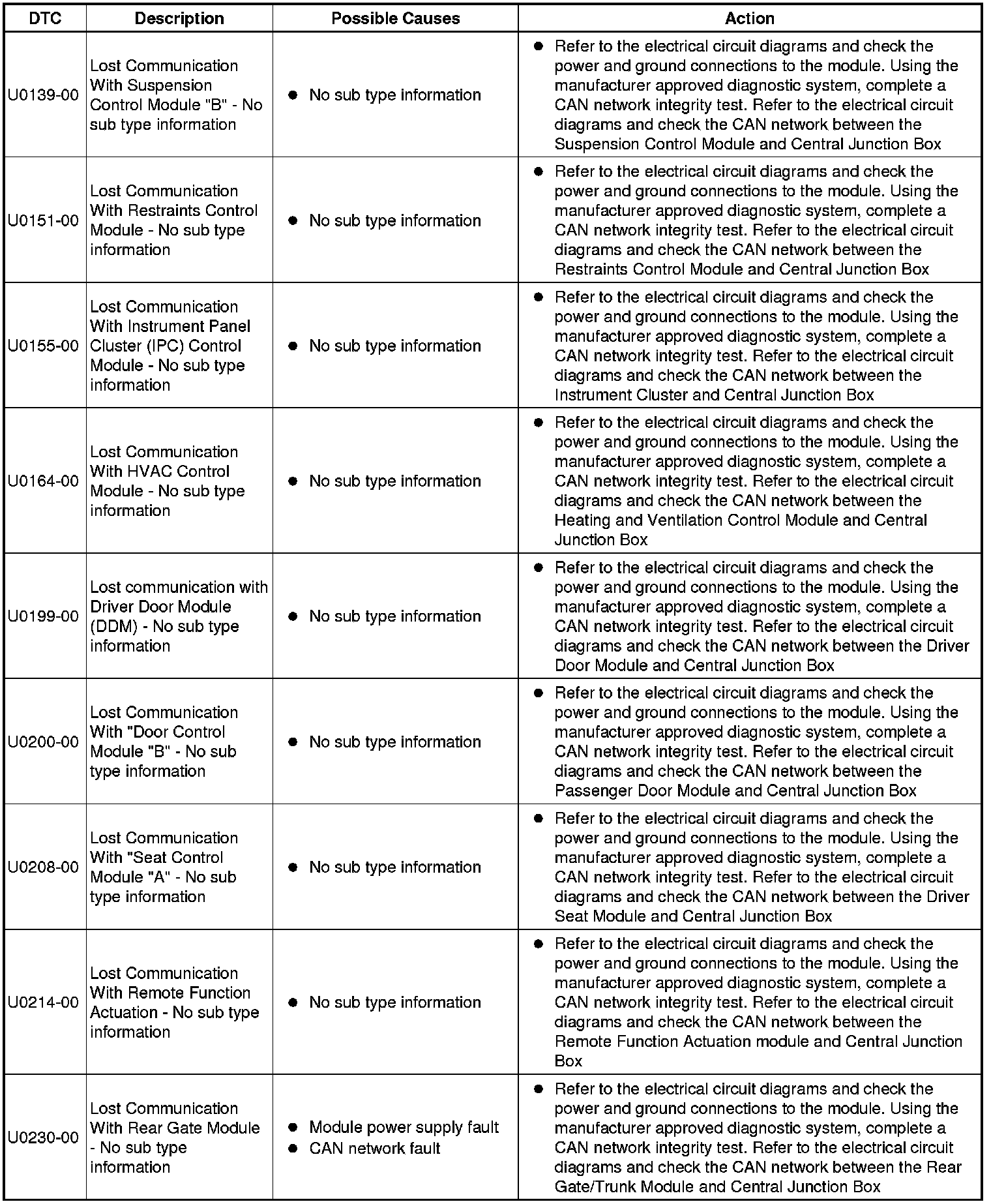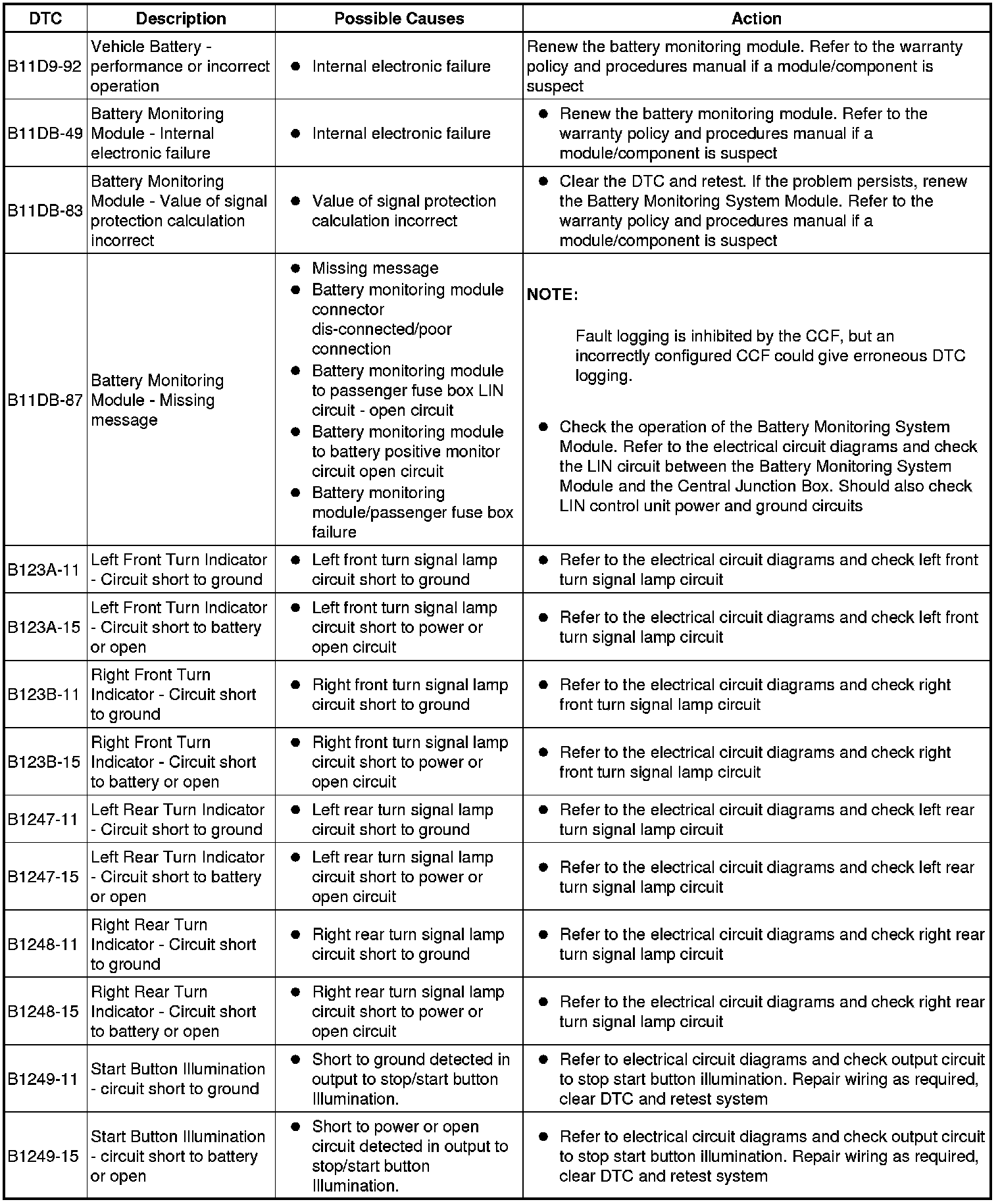 The table below lists all Diagnostic Trouble Codes (DTCs) that could be logged in the Central Junction Box, for additional Diagnosis and Testing information refer to the relevant Diagnosis and Testing Section. For additional information, refer to Communications Network Testing and Inspection