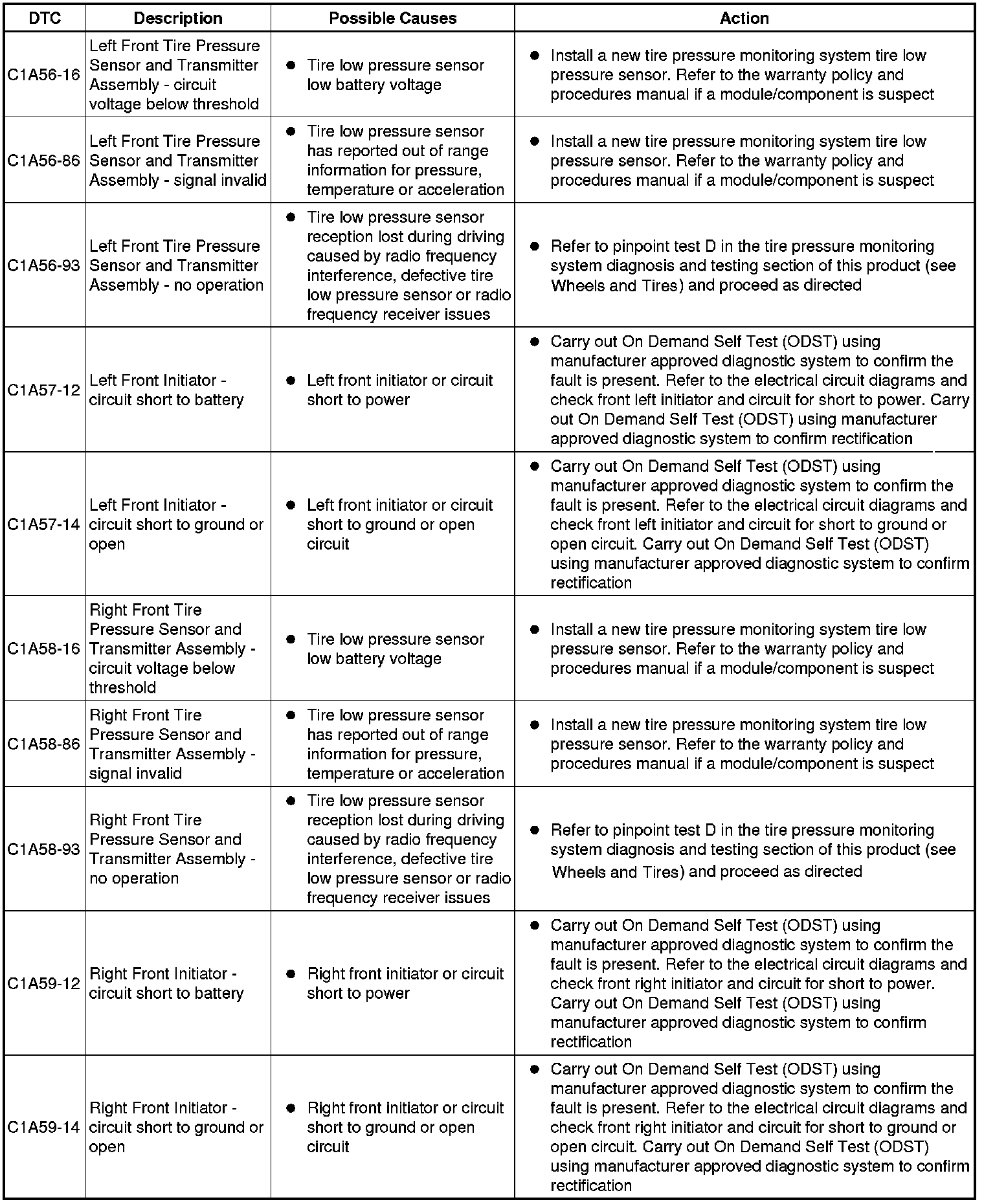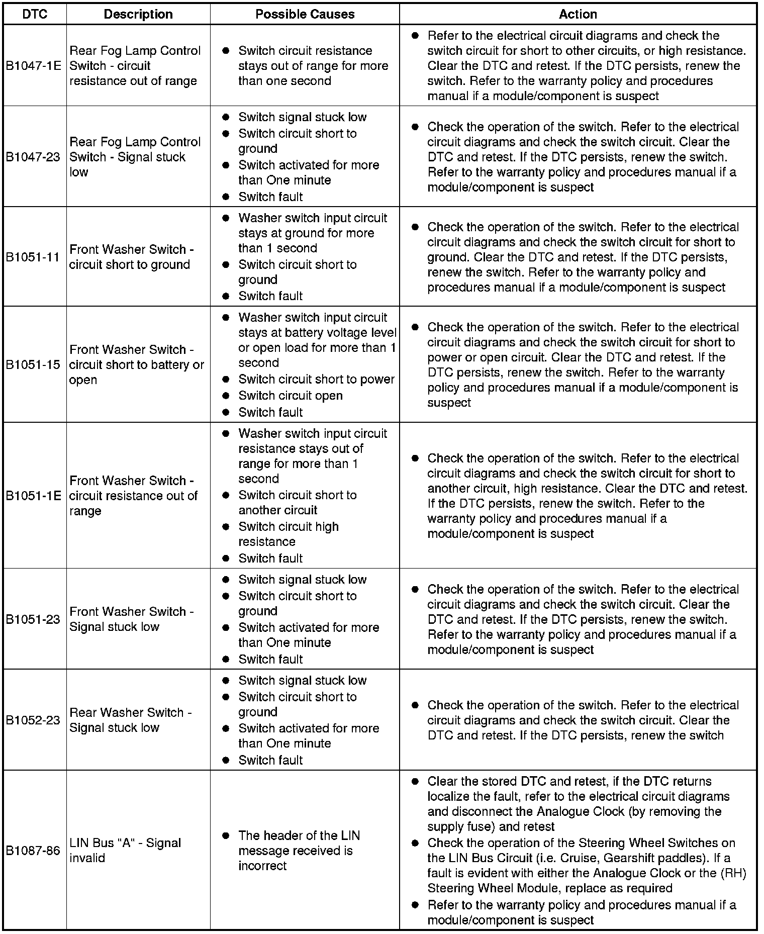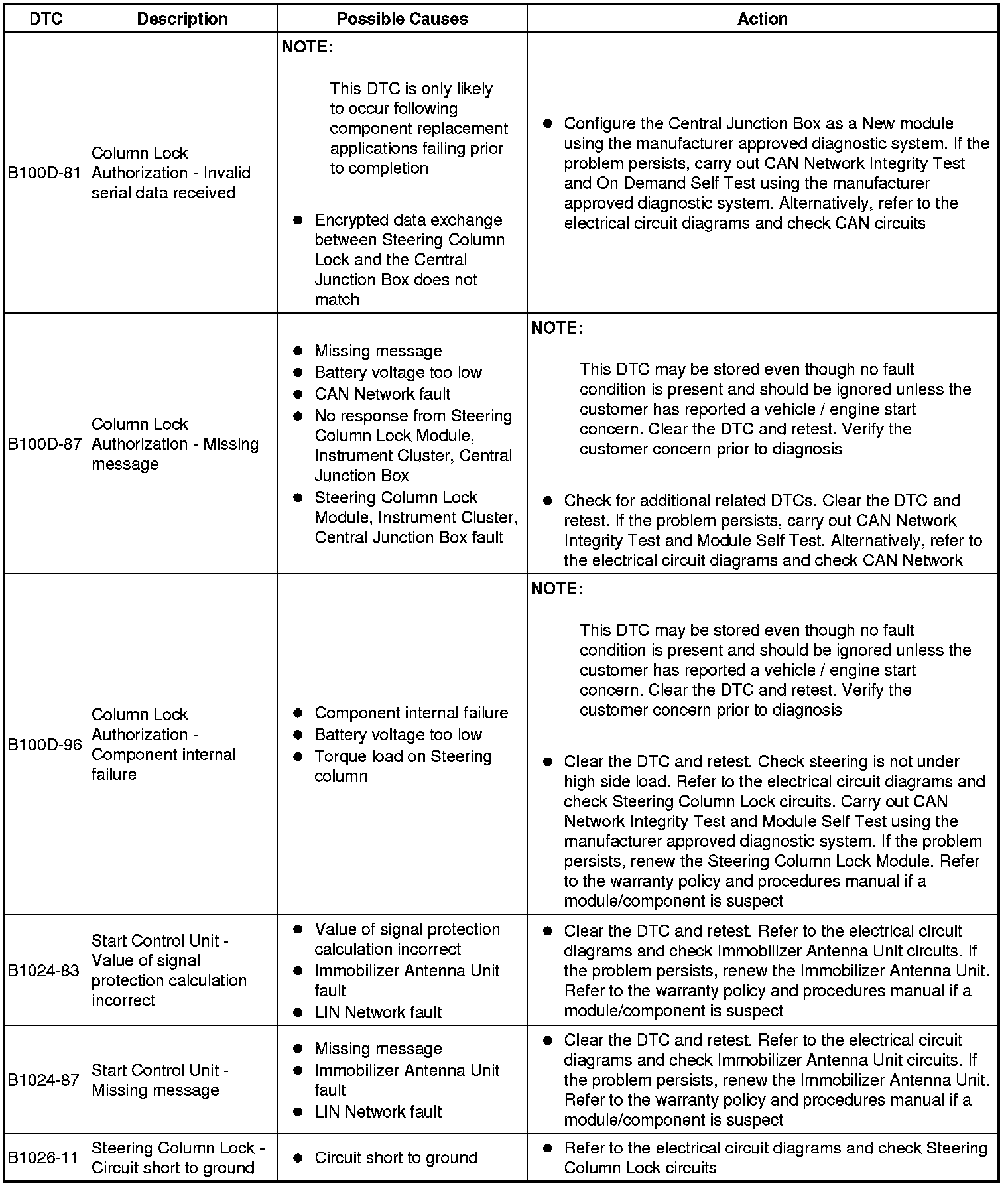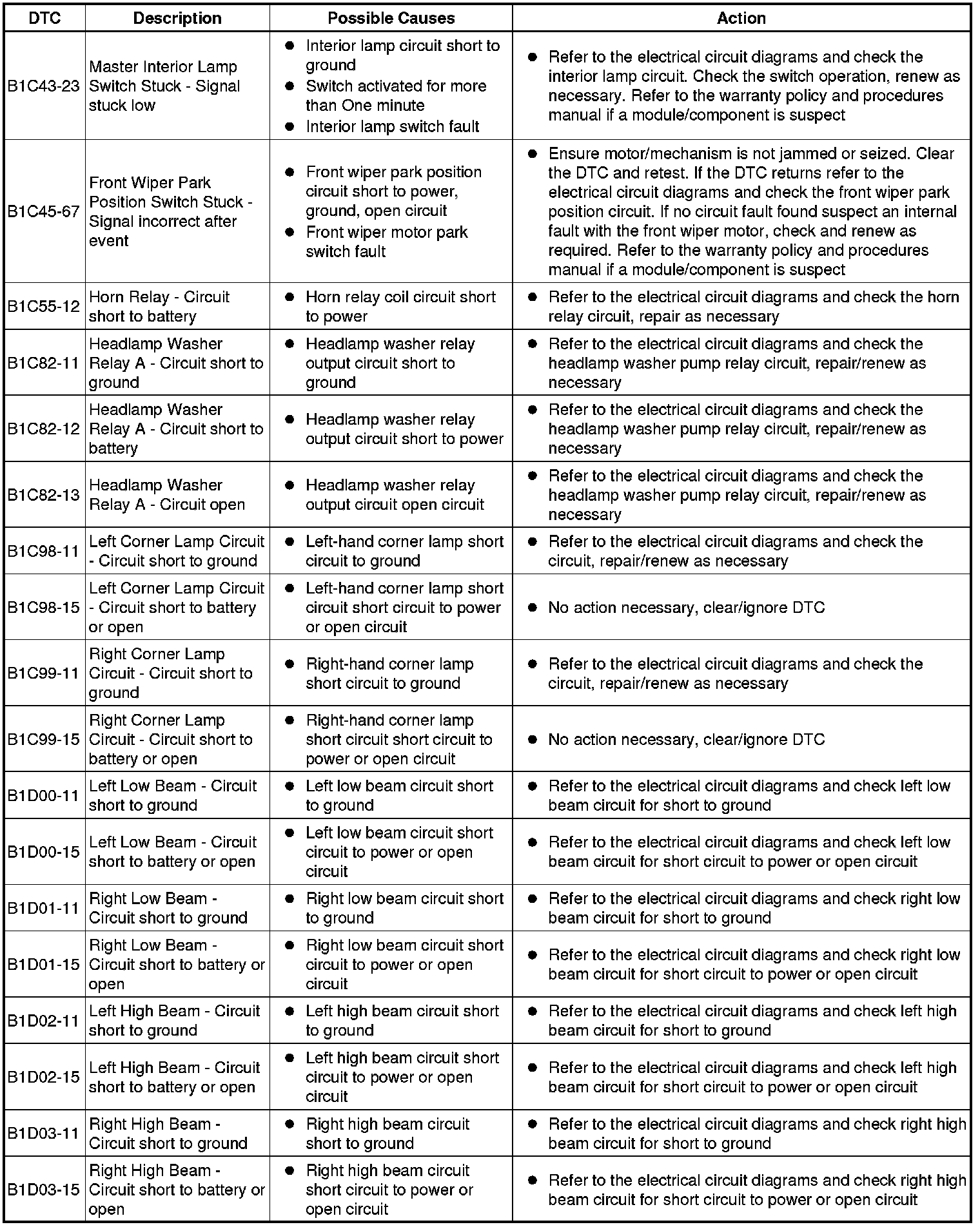 The table below lists all Diagnostic Trouble Codes (DTCs) that could be logged in the Central Junction Box, for additional Diagnosis and Testing information refer to the relevant Diagnosis and Testing Section. For additional information, refer to Communications Network Testing and Inspection