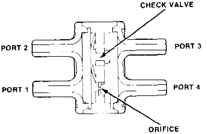 Ports 1 and 2 and ports 3 and 4 of this valve are connected internally. When vacuum is greater at port 4 then at port 1 (such as during sudden acceleration), air must flow through the orifice to equalize pressure. This creates a momentary delay that prevents a sudden decrease in spark advance. When vacuum is greater at port 1 than at port 4, air flows freely through the unseated check valve and the pressure is instantly equalized.