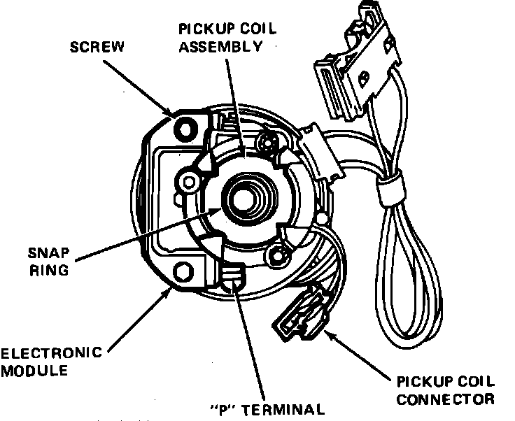 5. Remove pickup coil retainer ring, disconnect pickup coil electrical connector from module and remove pickup coil, Fig. 6. Do not remove the three screws located on the pickup coil.