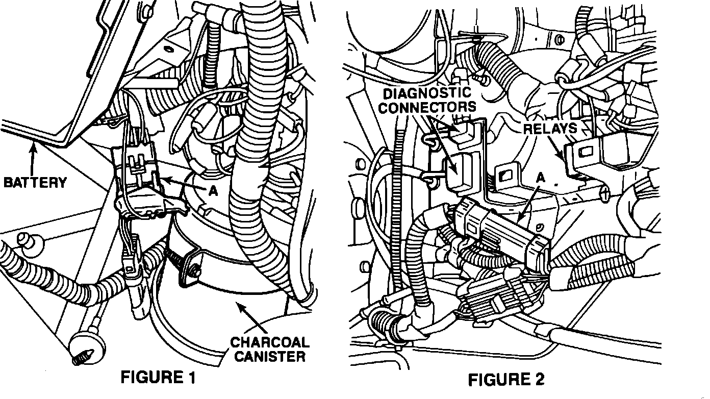 1. Locate the Electronic Engine Control (EEC) harness connector (A) in the engine compartment. The connector can be found on the right wheel well near the fuel pump relay and B+ latch relay on the Cherokee, Wagoneer and Comanche models, and between the battery and charcoal canister on Wrangler models.