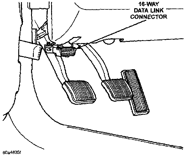 2. Connect the DRB scan tool to the 16-way data link wire harness connector. The connector is located on the driver side lower edge of the instrument panel, outboard of the steering column.