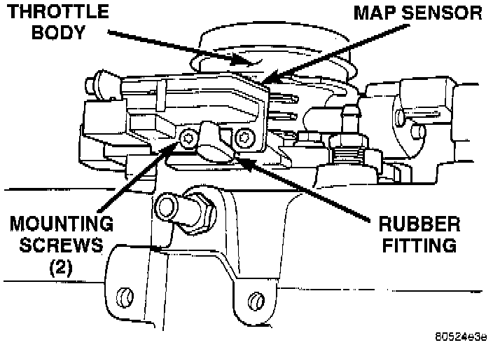 The Manifold Absolute Pressure (MAP) sensor is mounted to the side of the throttle body (Fig. 34). An L-shaped rubber fitting is used to connect the MAP sensor to throttle body (Fig. 38).