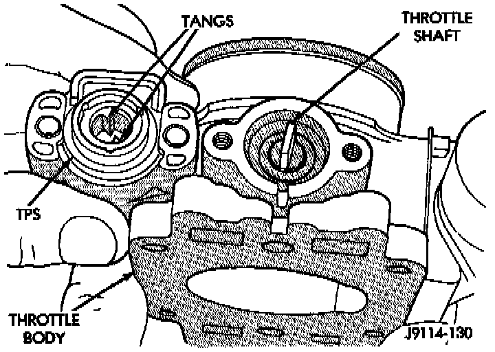The throttle shaft end of the throttle body slides into a socket in the TPS (Fig. 36). The TPS must be installed so that it can be rotated a few degrees. (If the sensor will not rotate, install the sensor with the throttle shaft on the other side of the socket tangs). The TPS will be under slight tension when rotated.