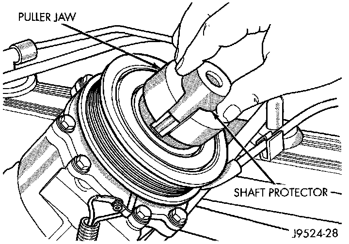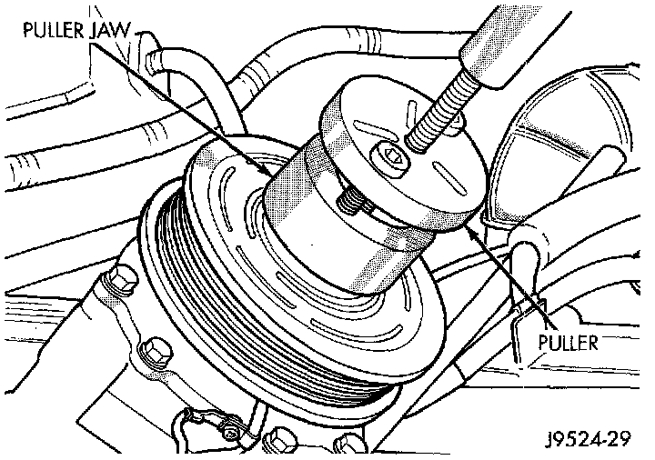 11. Install the puller through-bolts (Special Tool C-6461) through the puller flange and into the jaws of the rotor puller and tighten.Turn the puller center bolt clockwise until the rotor pulley is free.