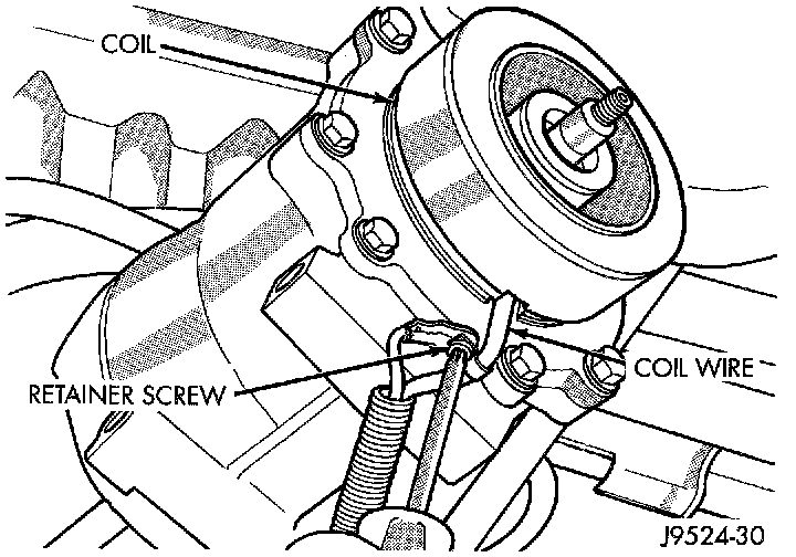 12. Remove the screw and retainer from the clutch coil lead wire harness on the compressor front housing.