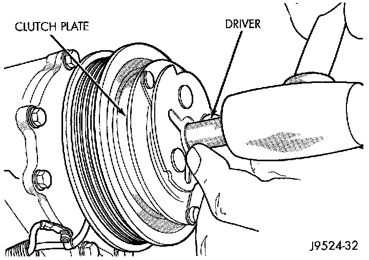 Examine the friction surfaces of the clutch pulley and the front plate for wear. The pulley and front plate should be replaced if there is excessive wear or scoring.