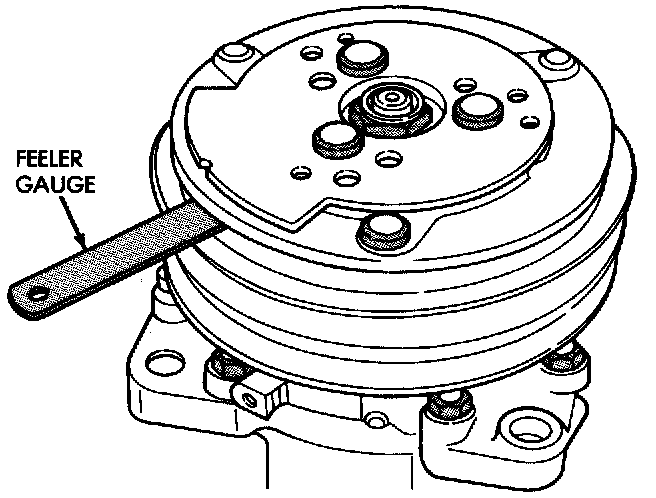 NOTE: The air gap is determined by the spacer shims. When installing an original, or a new clutch assembly, try the original shims first. When installing a new clutch onto a compressor that previously did not have a clutch, use 1.0, 0.50, and 0.13 millimeter (0.040, 0.020, and 0.005 inch) shims from the clutch hardware package that is provided with the new clutch.