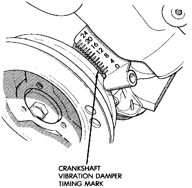 7. Slowly continue to rotate engine. Do this until timing index mark on vibration damper pulley aligns with top dead center (TDC) mark (0 degree) on timing degree scale. Always rotate engine in direction of normal rotation. Do not rotate engine backward to align timing marks.