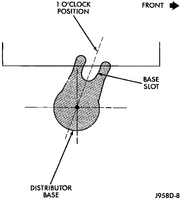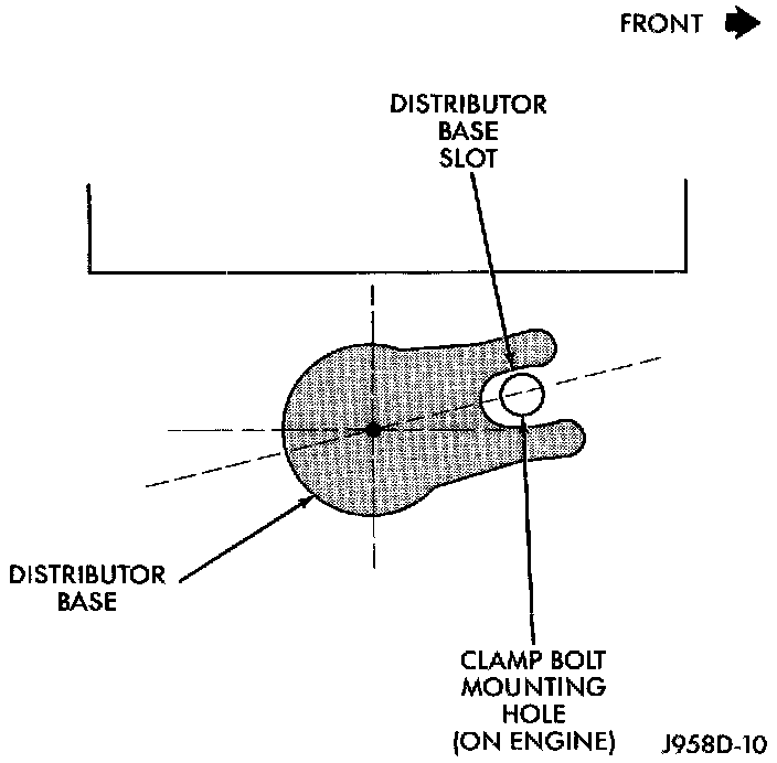 - Centerline of slot at base of distributor is aligned to centerline of distributor hold-down bolt hole on engine. In this position, the hold-down bolt should easily pass through slot and into engine.