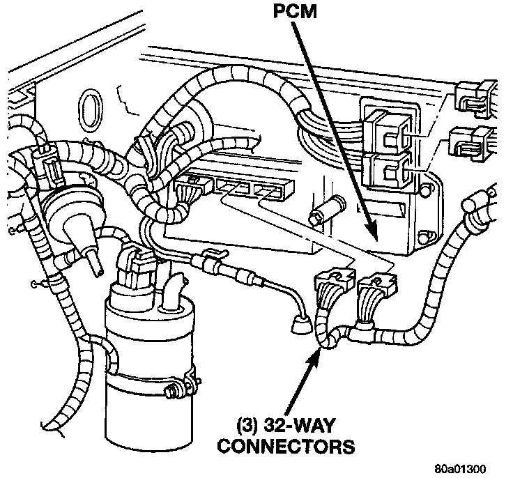 The Powertrain Control Module (PCM) is located on the cowl panel in the right/rear side of the engine compartment (Fig. 77).