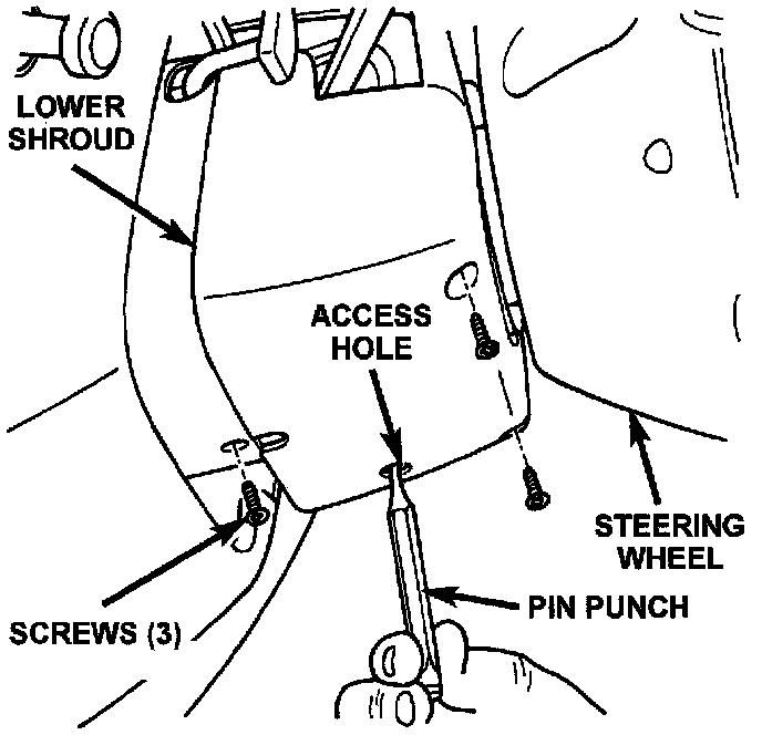 4. Insert a small screwdriver or pin punch through the access hole in the lower steering column shroud and depress the ignition lock cylinder retaining tumbler.
