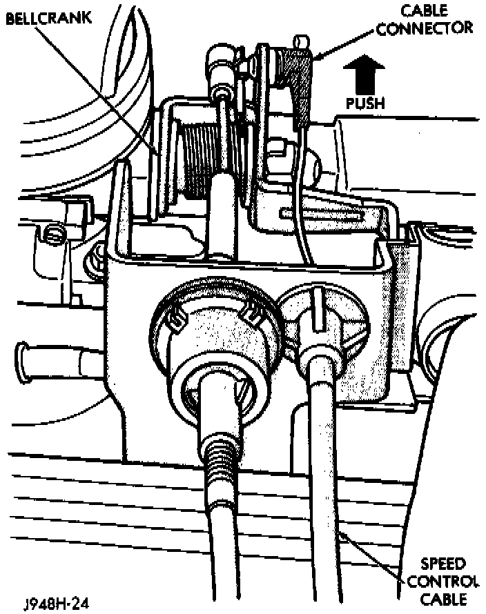 2. Using finger pressure only, remove cable connector by pushing connector off the throttle body bellcrank pin. DO NOT try to pull cable connector off perpendicular to the bellcrank pin. Connector will be broken.