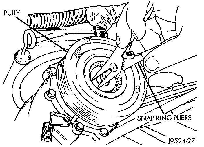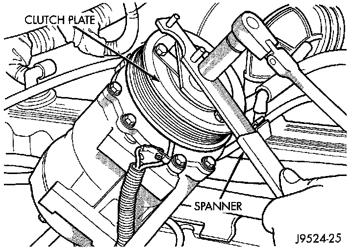 Examine the friction surfaces of the clutch pulley and the front plate for wear. The pulley and front plate should be replaced if there is excessive wear or scoring.